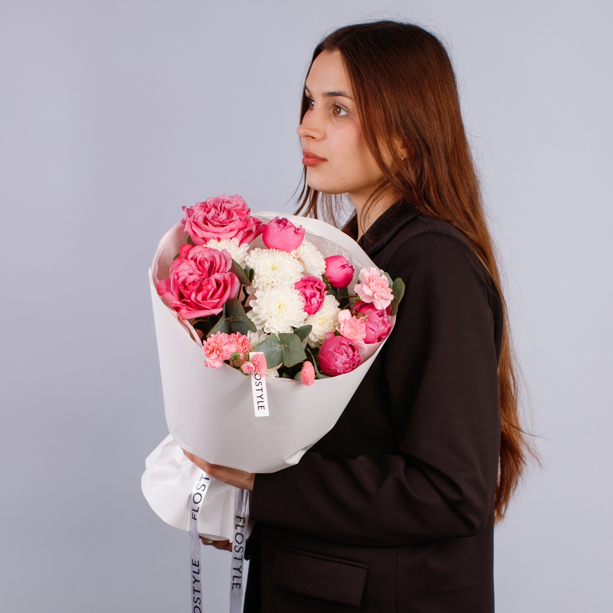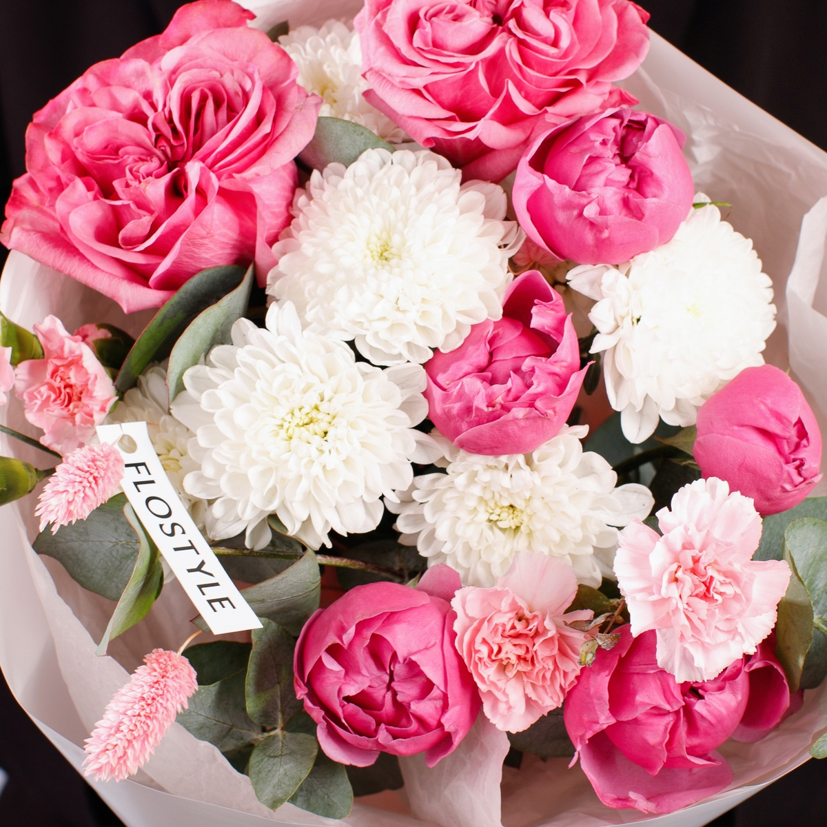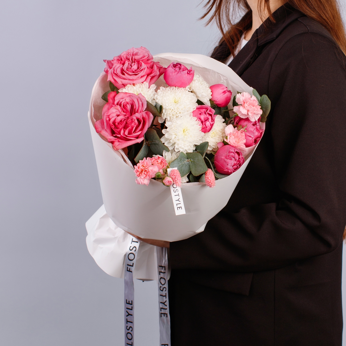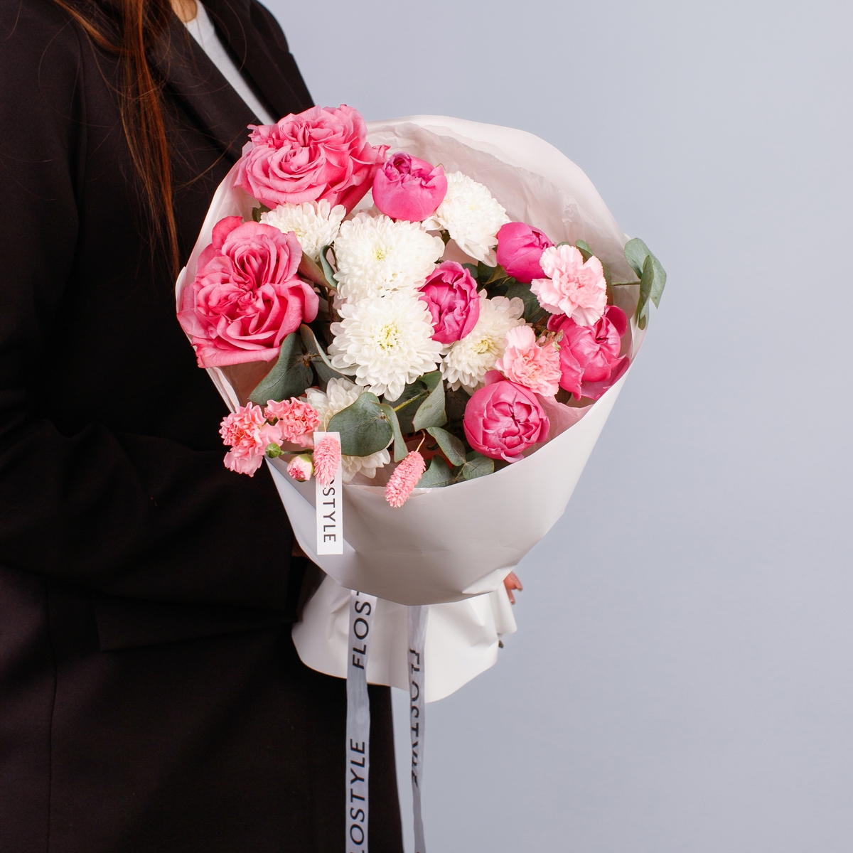 Состав: Роза Country Blues - 2 шт, Хризантема Altaj - 1 шт, Роза кустовая Misty Bubbles - 1 шт, Диантус кустовой Pink - 2 шт, Фалярис розовый - 3 шт, Эвкалипт - 0,5 шт, Белая Тишью, Матовая пленка белая кругом