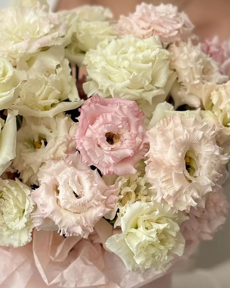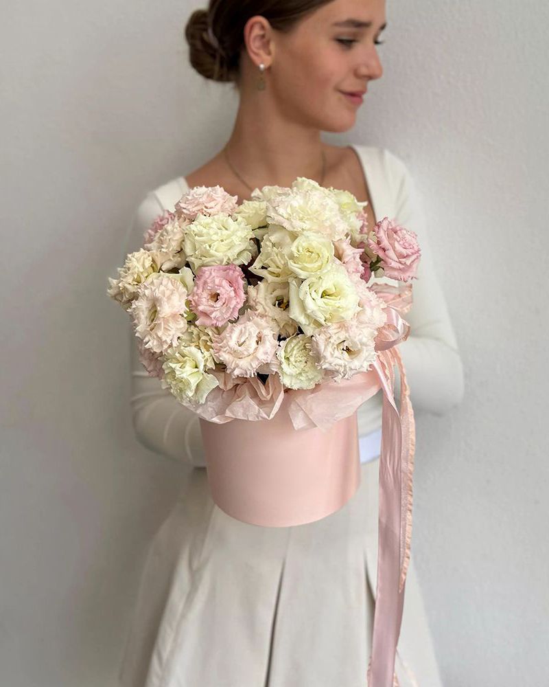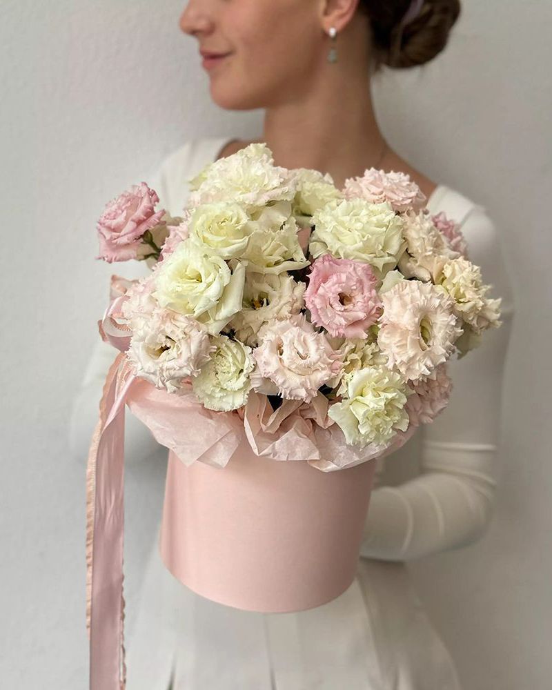Состав: Коробка S (Pink), Эустома Pink/White - 9 шт, Тишью розовое, Лента атласная