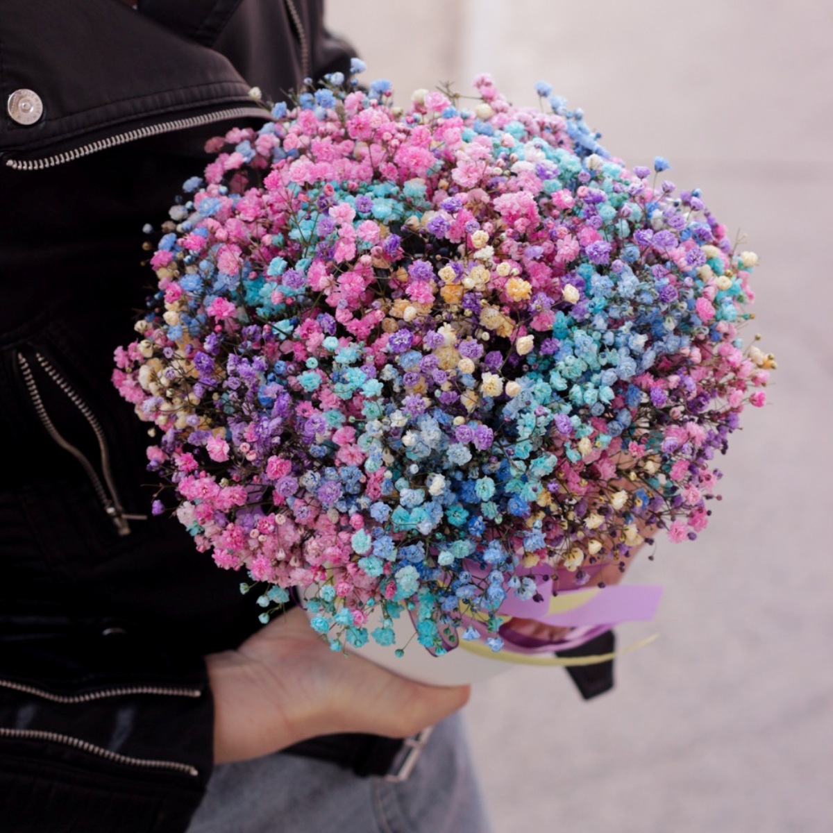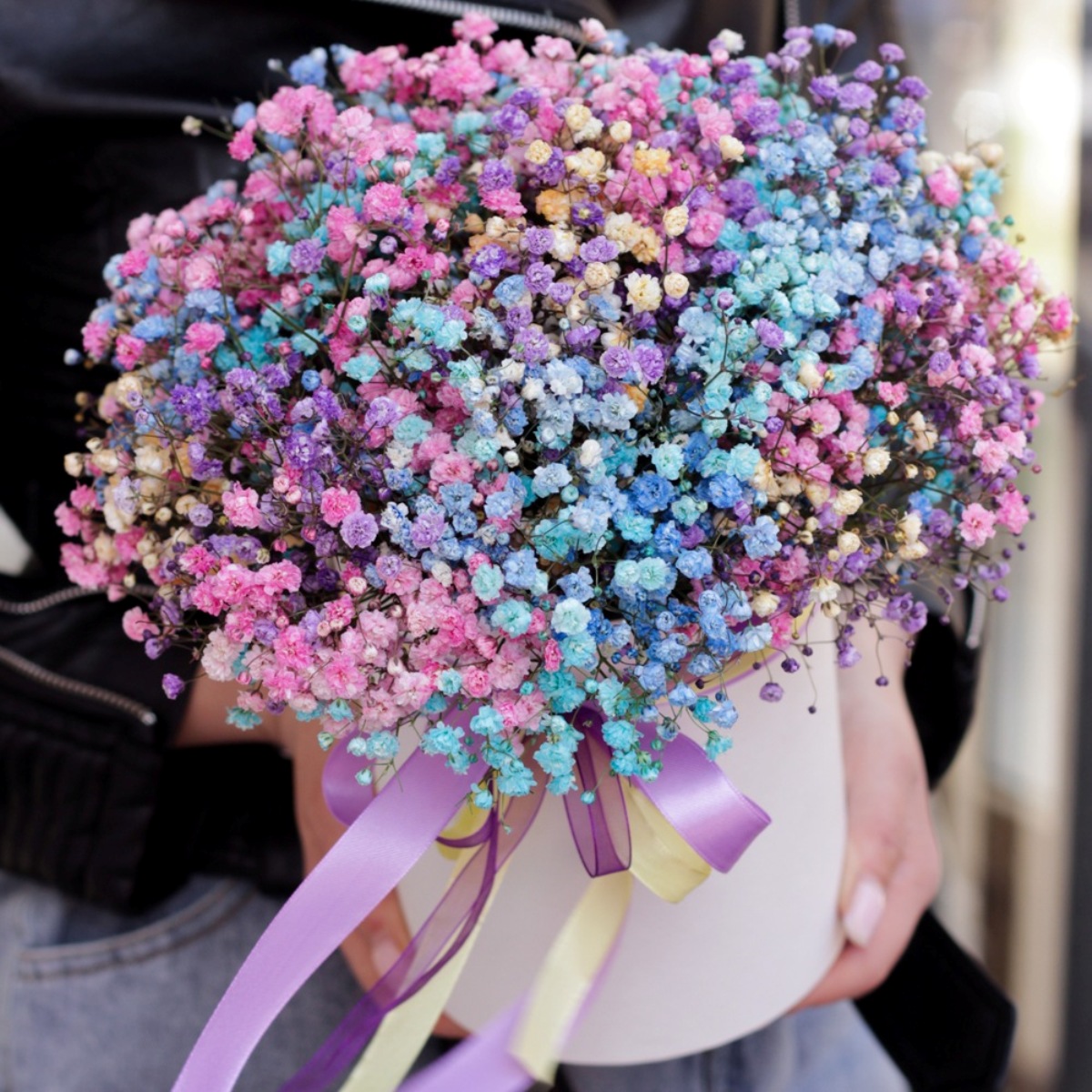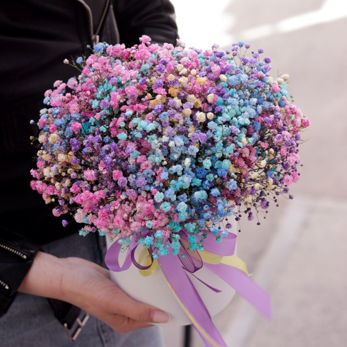 Состав: Коробка S (White), Гипсофила микс - 5 шт, Атласная лента