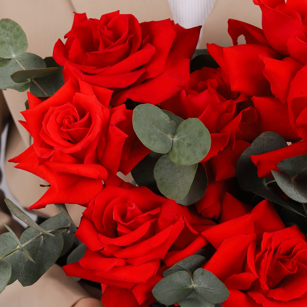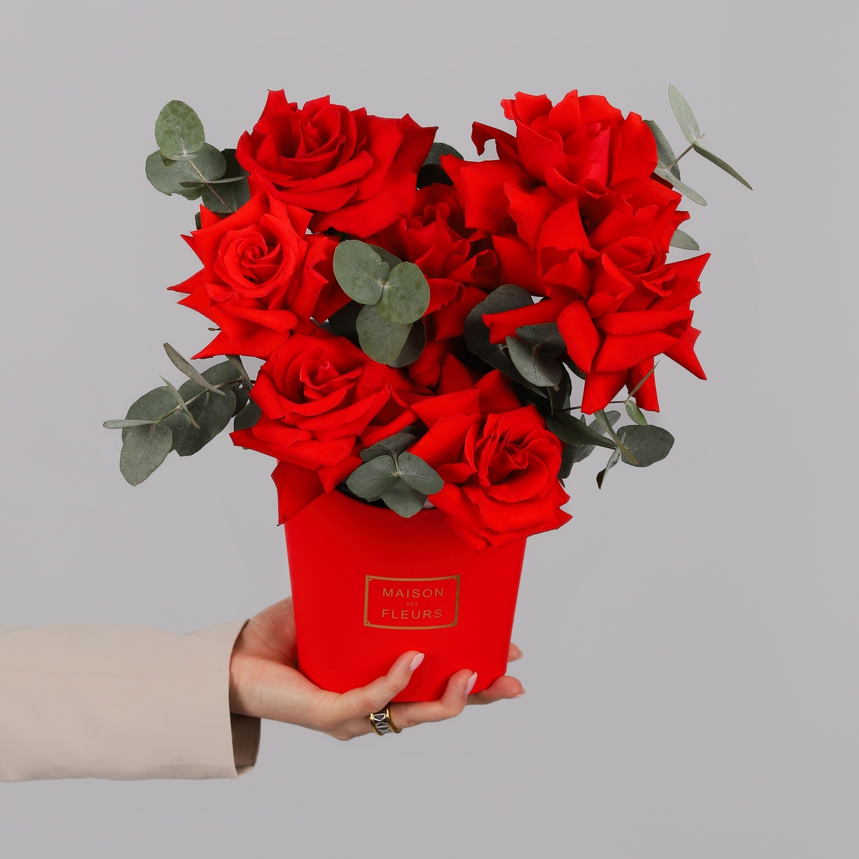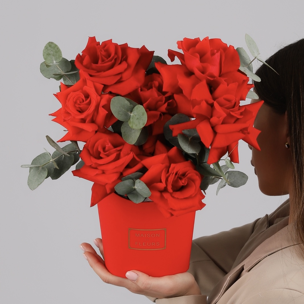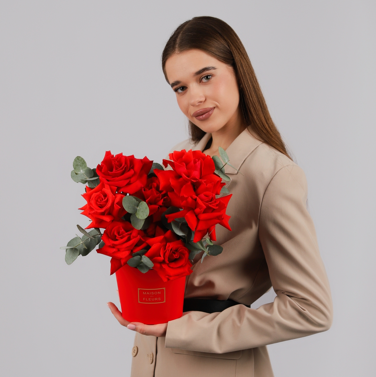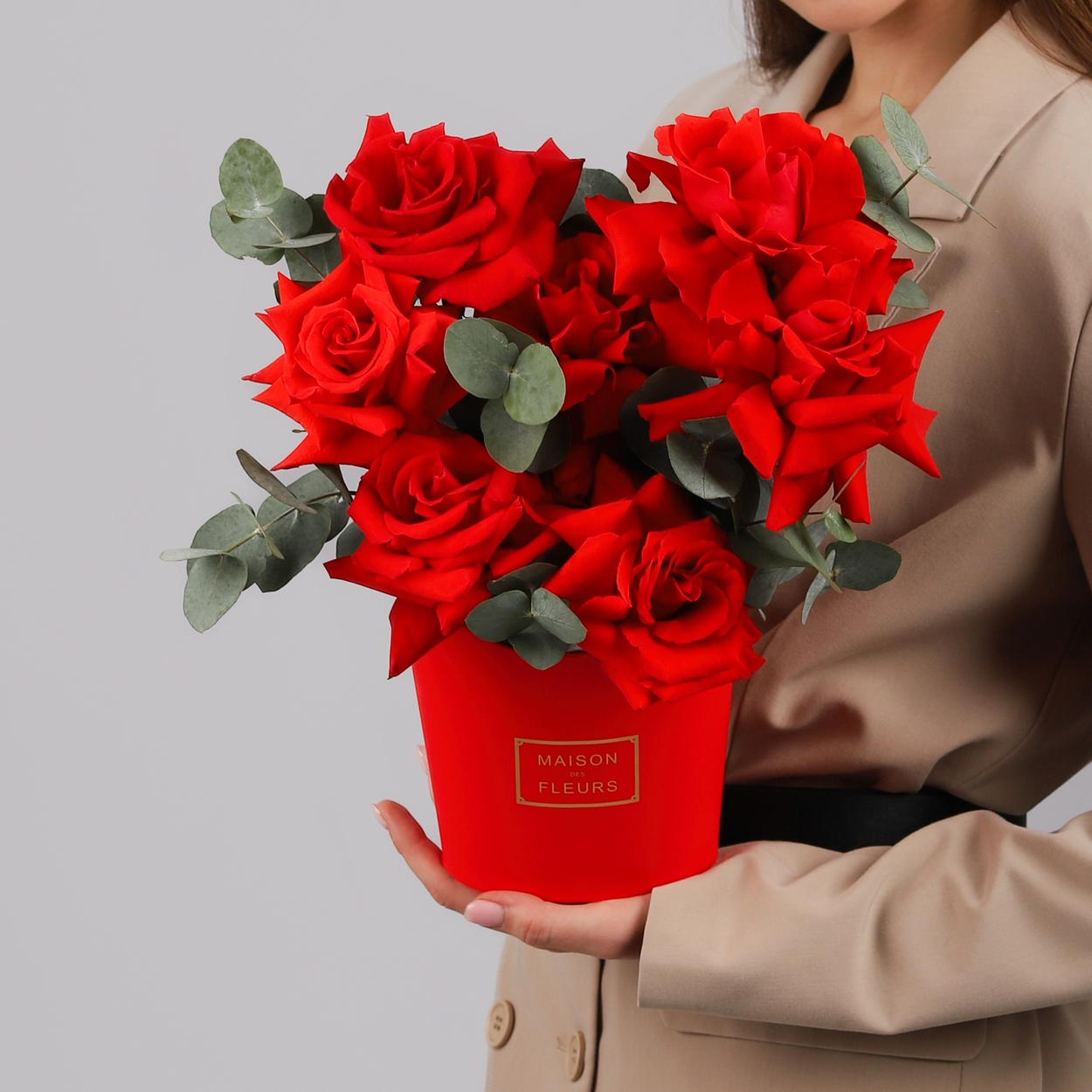 Состав: Коробка шляпная Maison красная, Роза Nina французская - 7 шт, Эвкалипт - 1 шт
