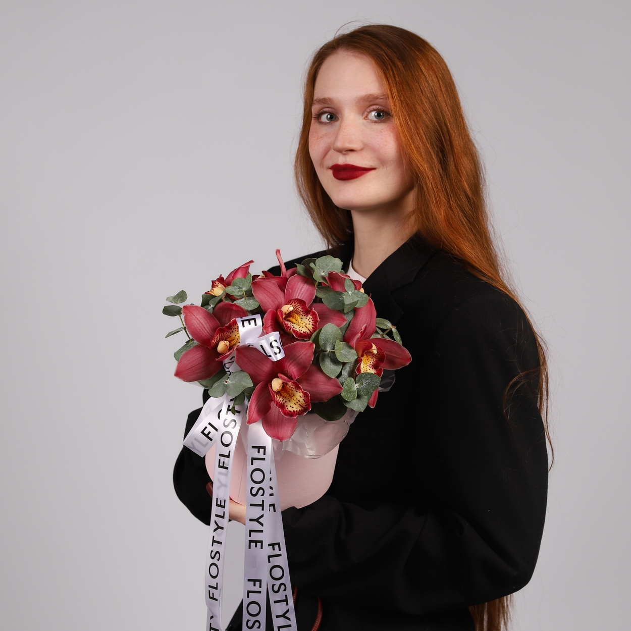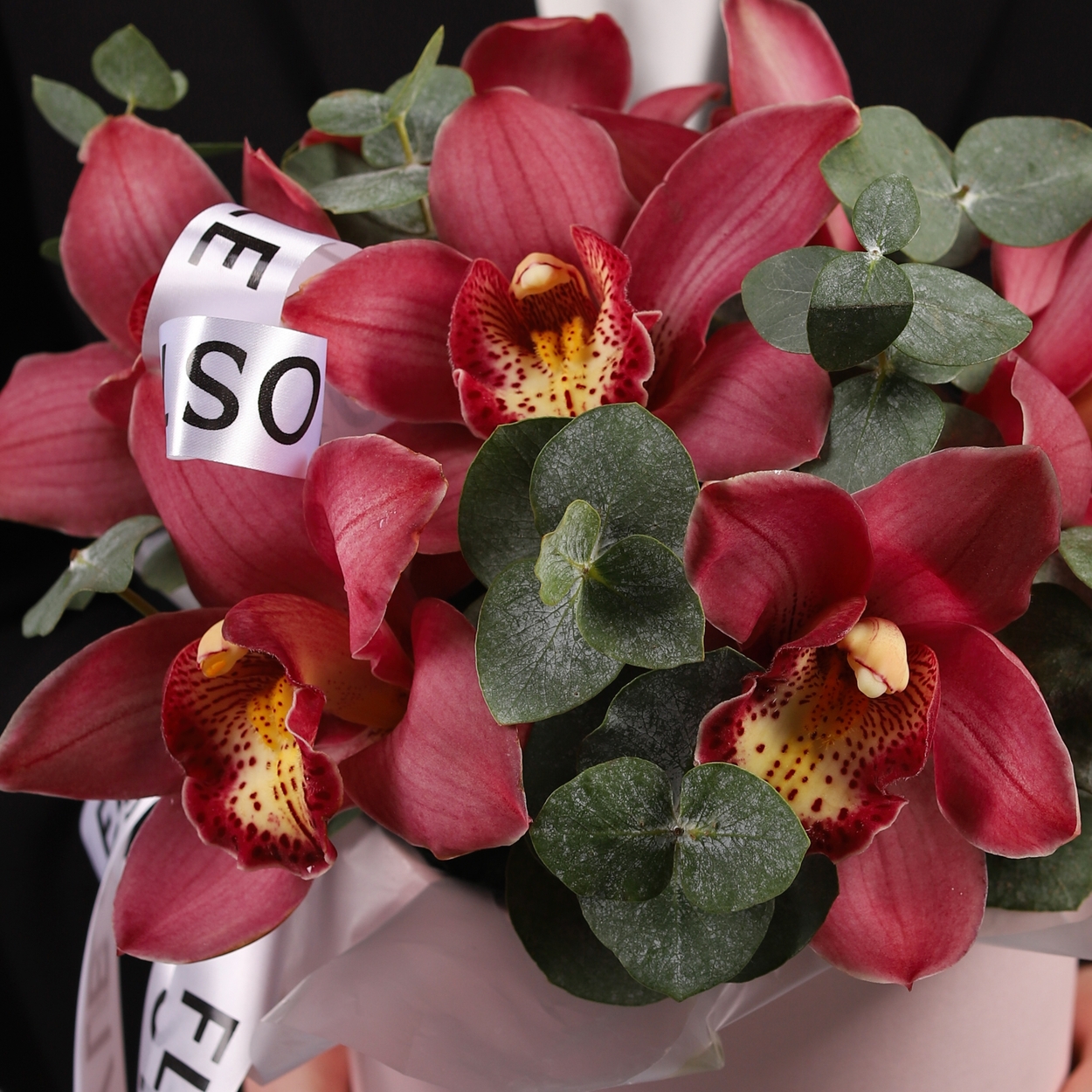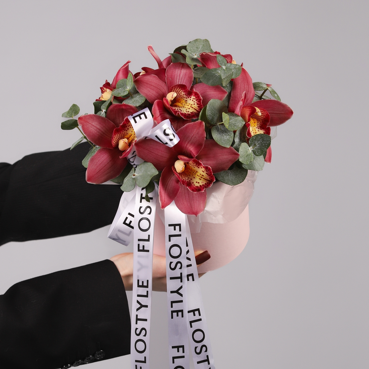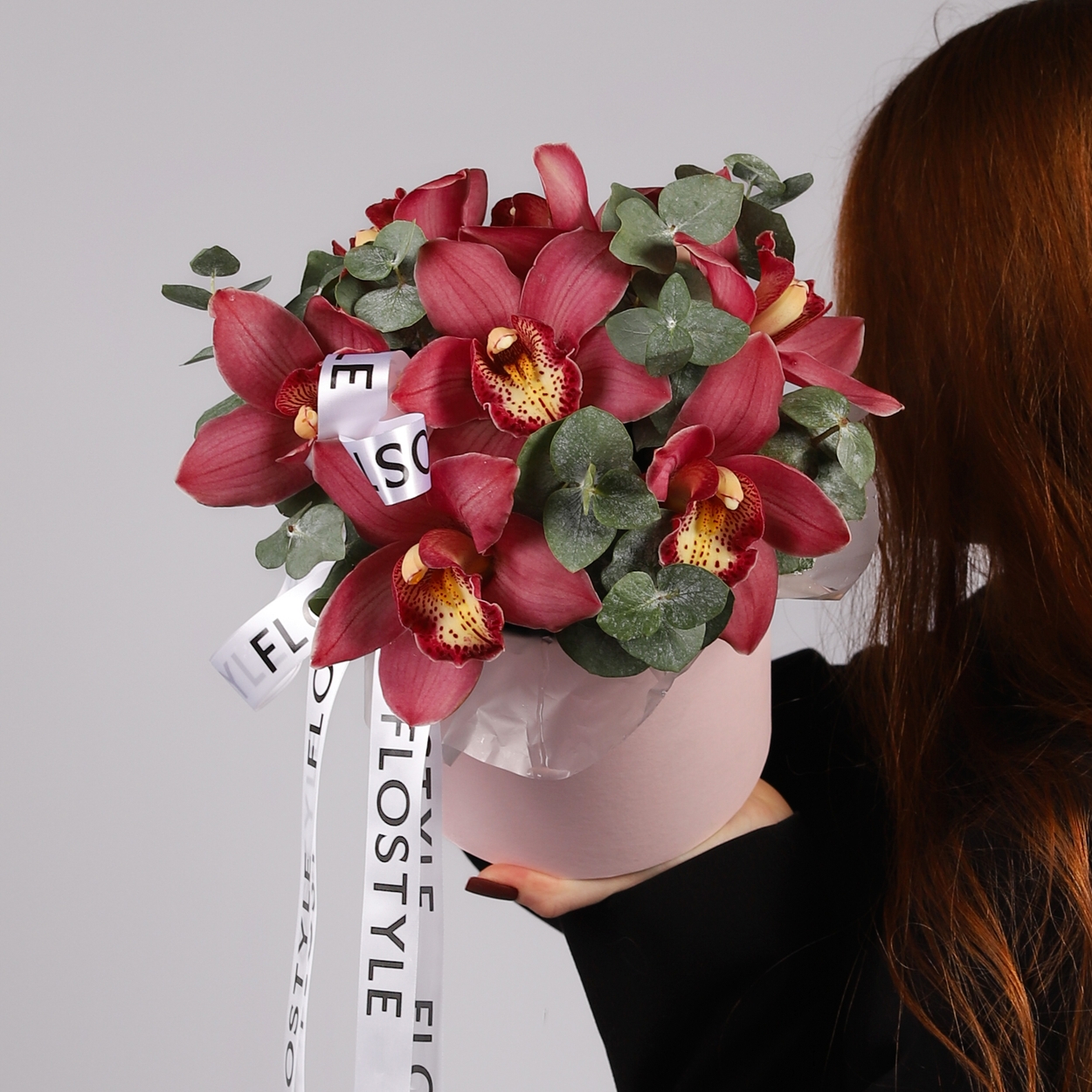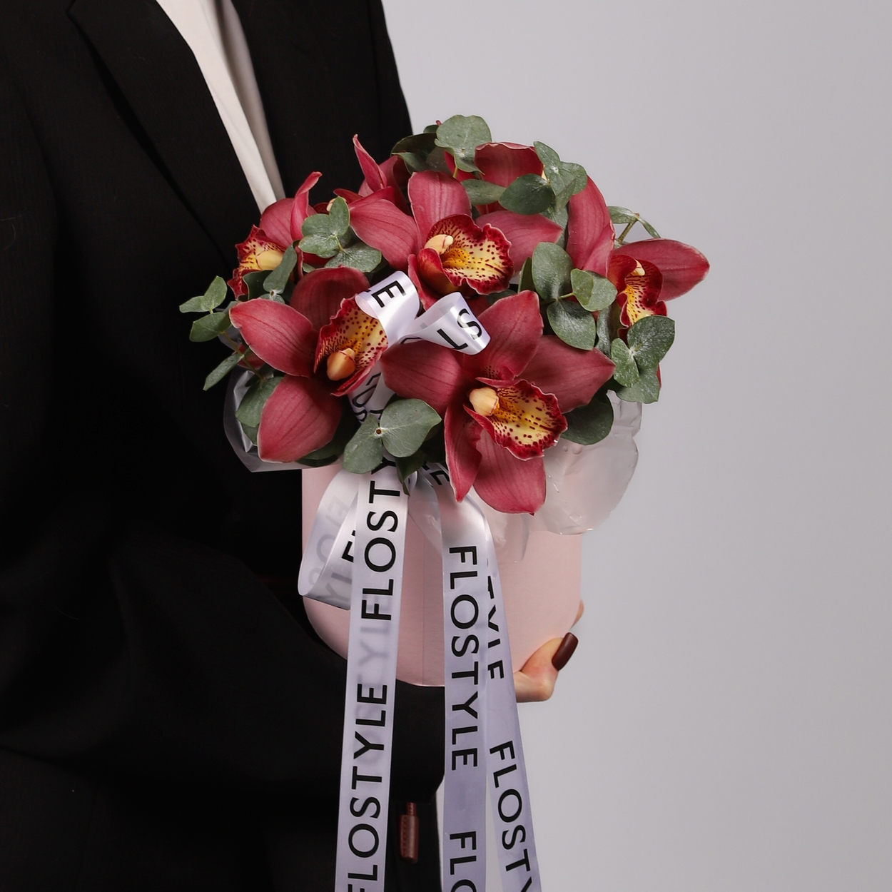 Состав: Коробка S розовая, Орхидея Pink - 7 шт, Эвкалипт - 0,5 шт, Атласная лента