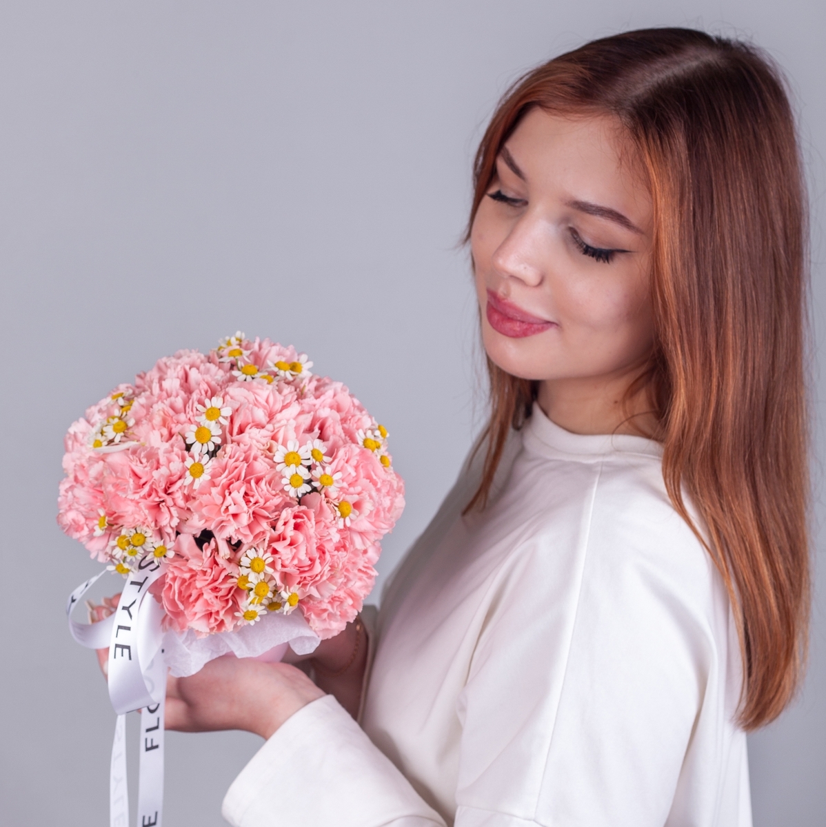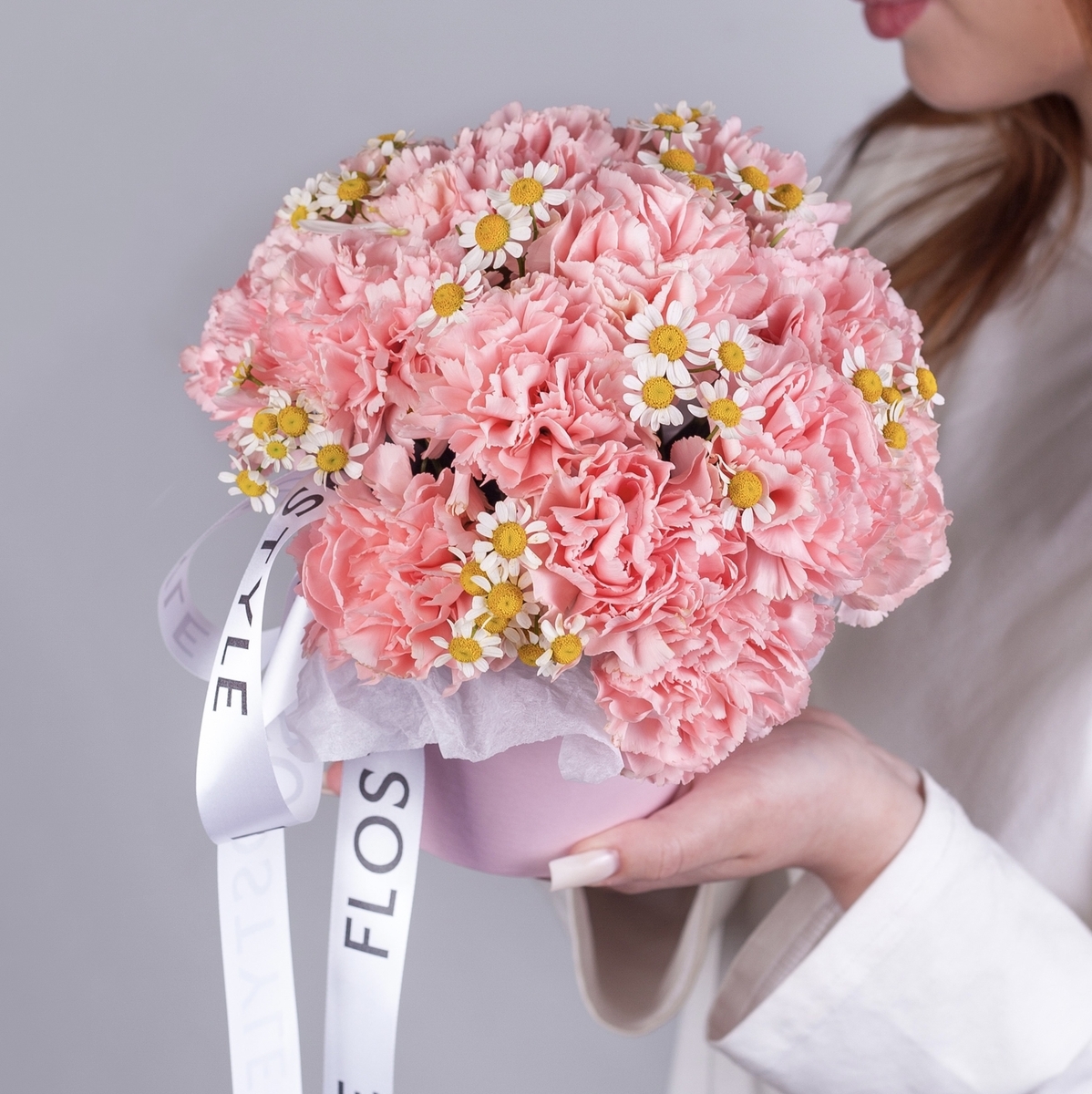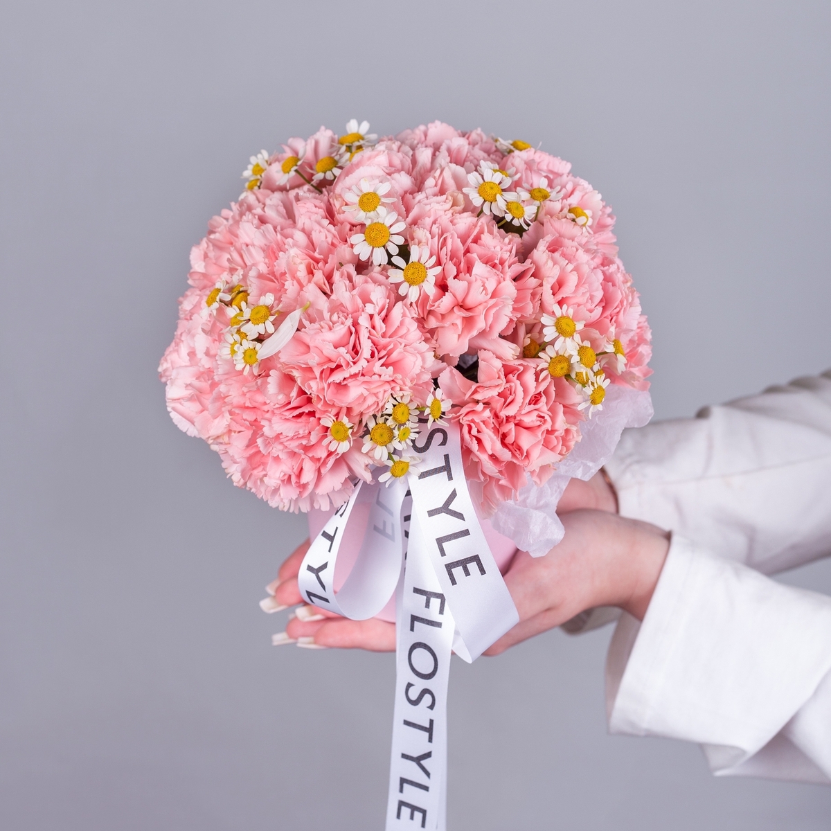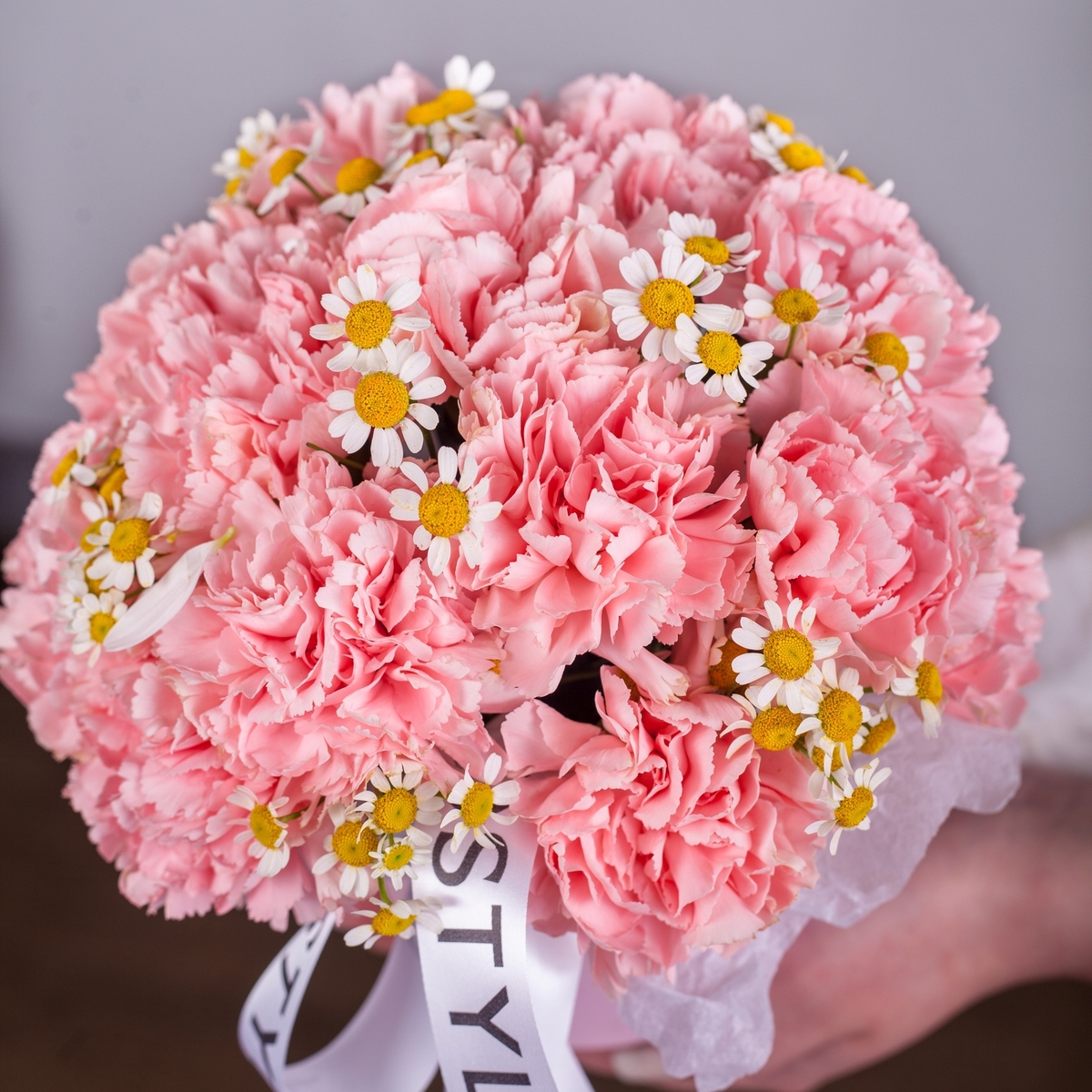Состав: Коробка XS (Pink), Диантус Pink - 15, Ромашка Танацетум - 1 шт, Лента атласная - 1 шт