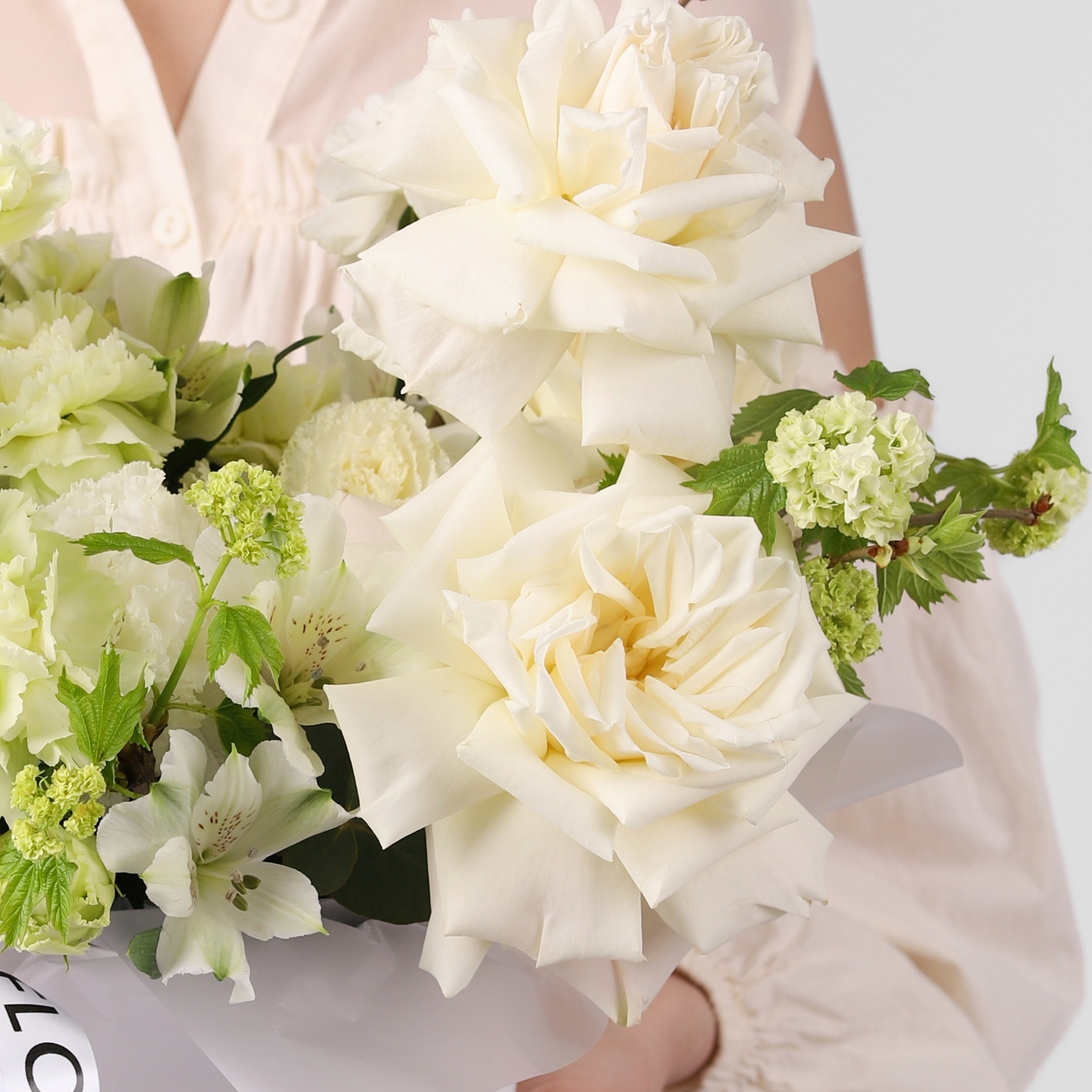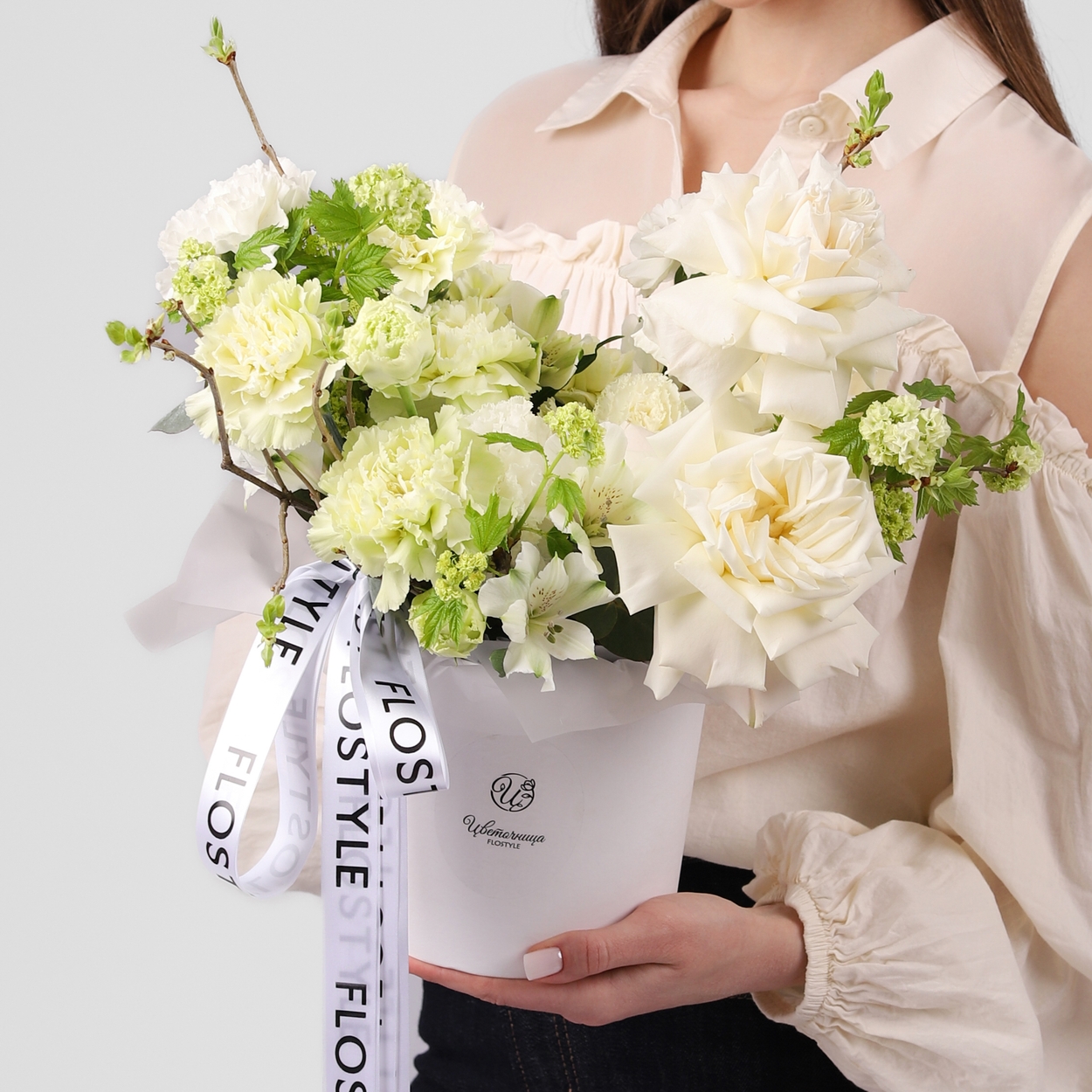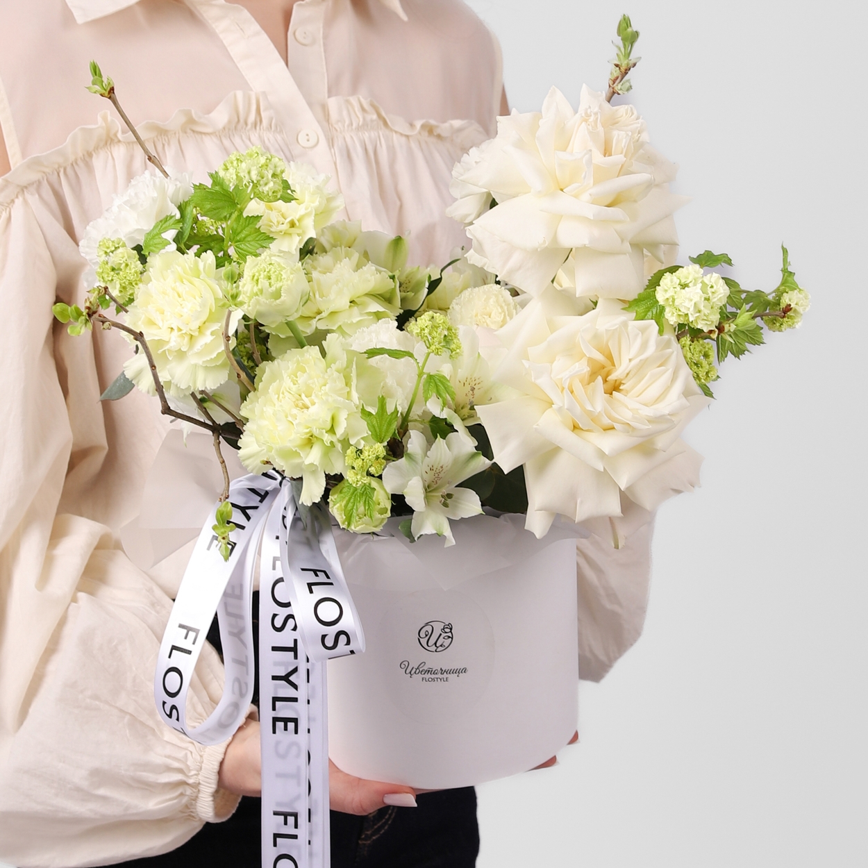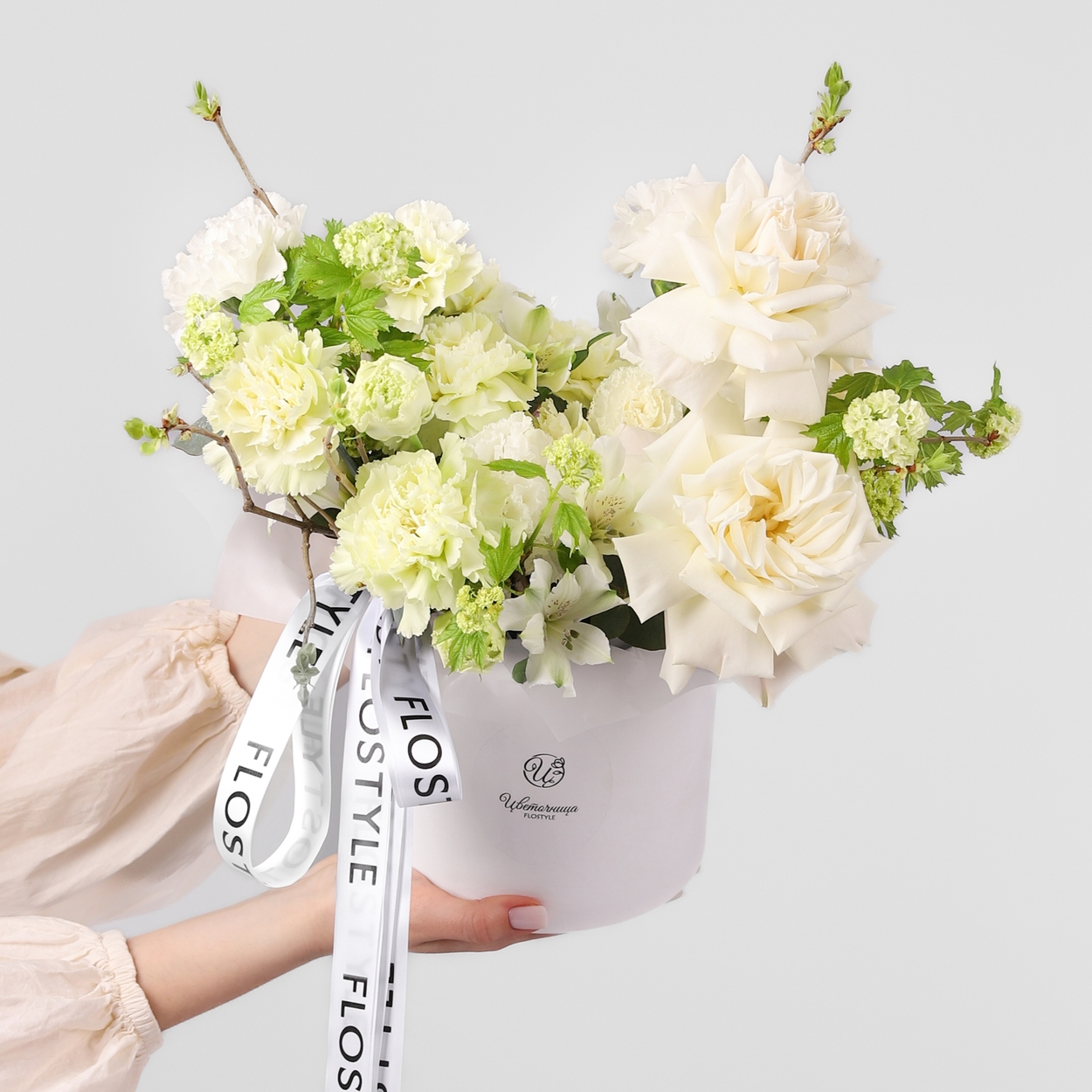 Состав: Коробка белая S, Роза Playa Blanca французская - 3 шт, Альстромерия - 2 шт, Диантус Green - 8 шт, Эустома White - 2 шт, Вибурнум - 3 шт, Ветки декоративные - 3 шт, лента атласная