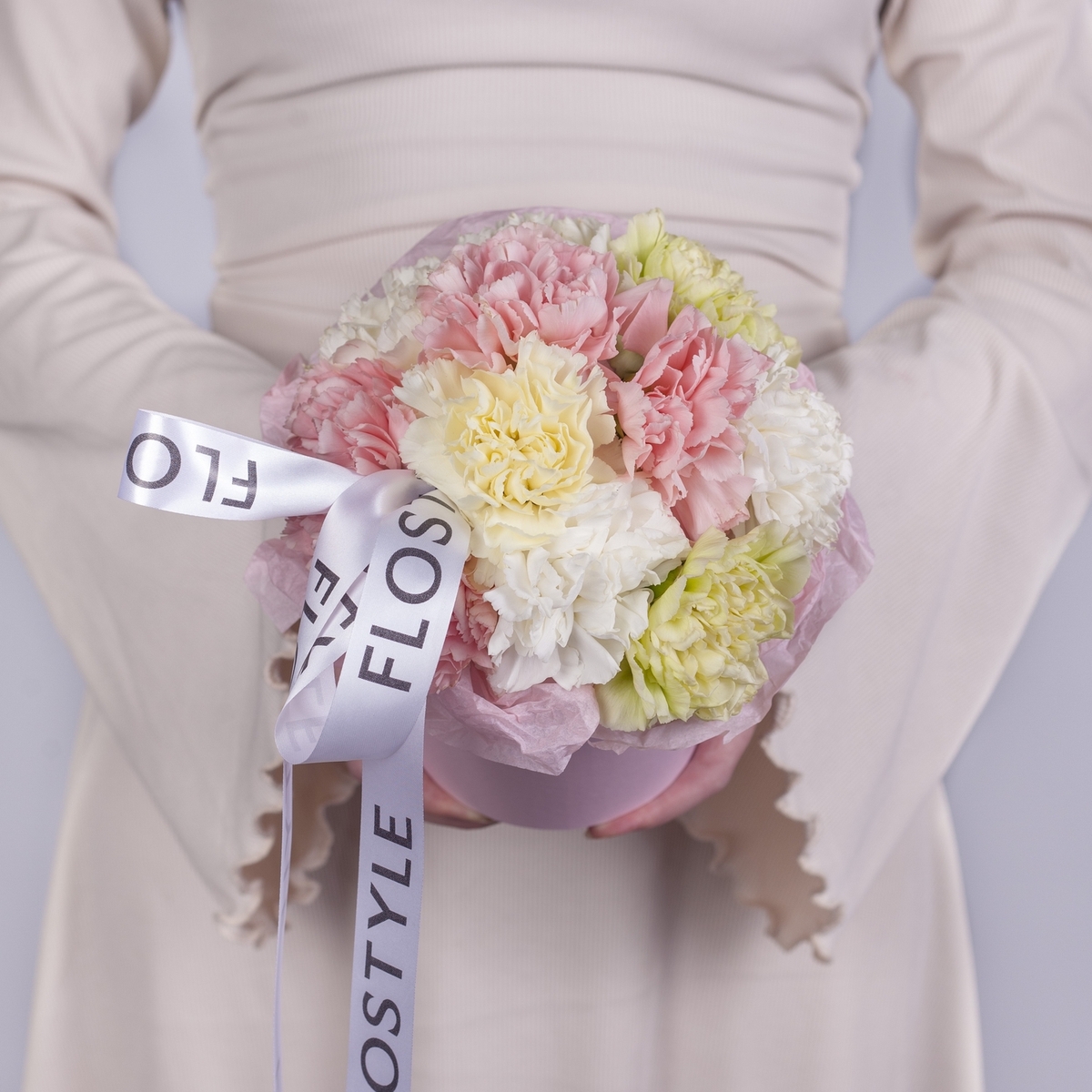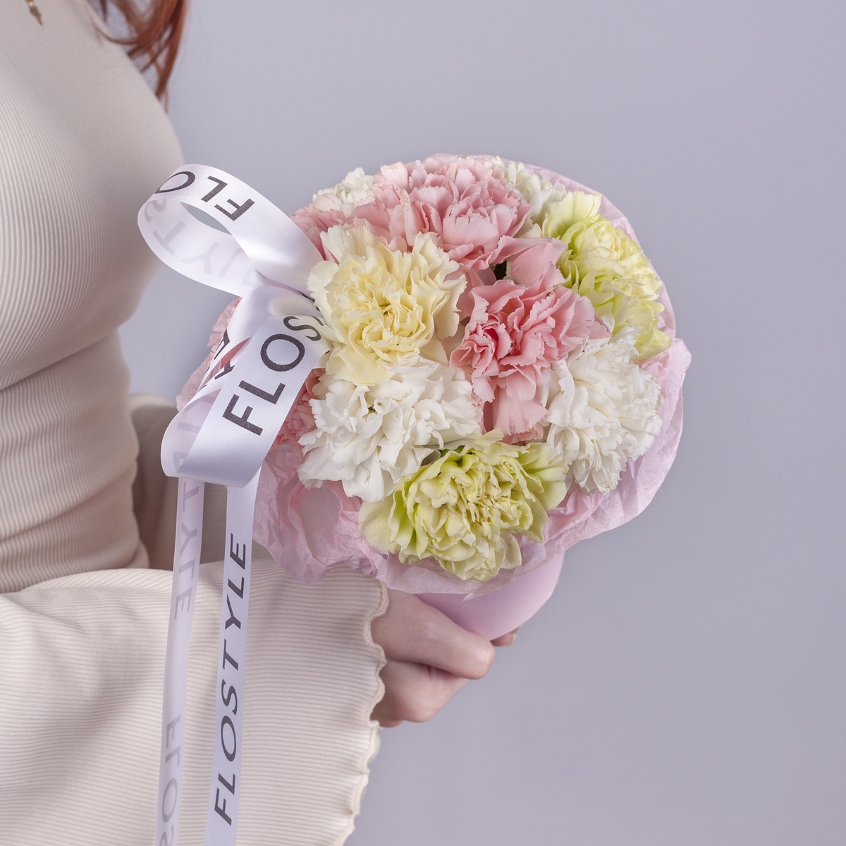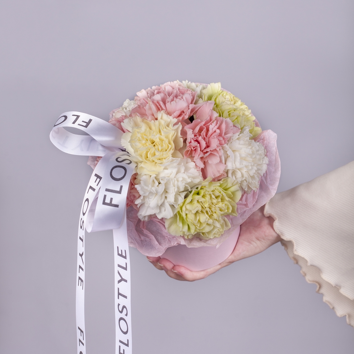Состав: Коробка XS (Pink), Диантус White/Pink/Green/Yellow - 11 шт, Тишью розовое, Атласная лента