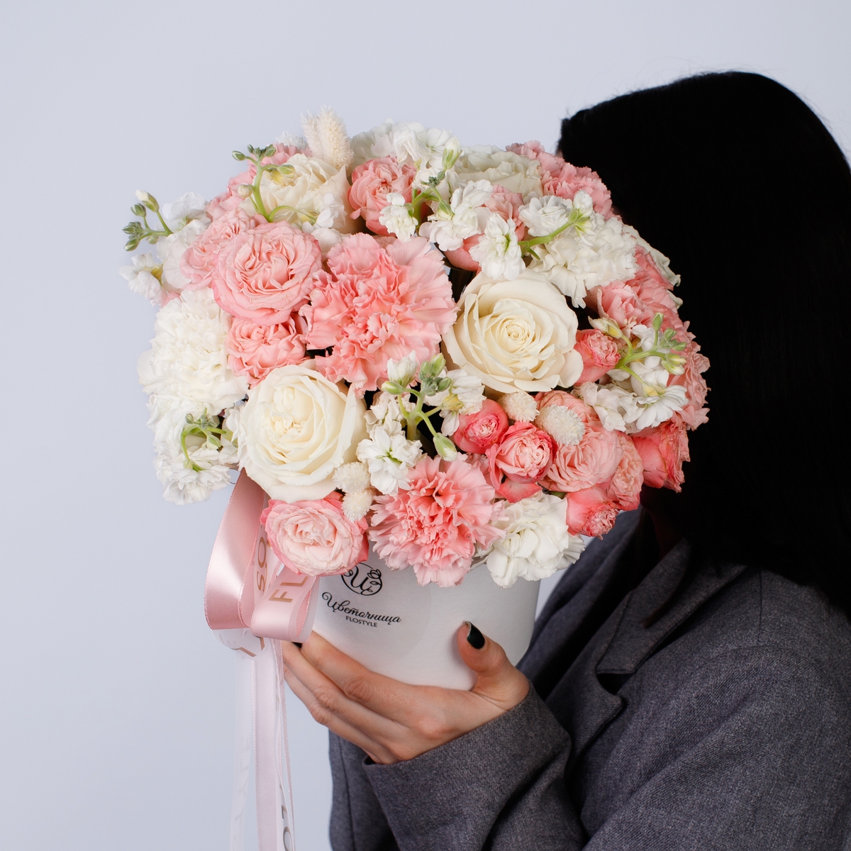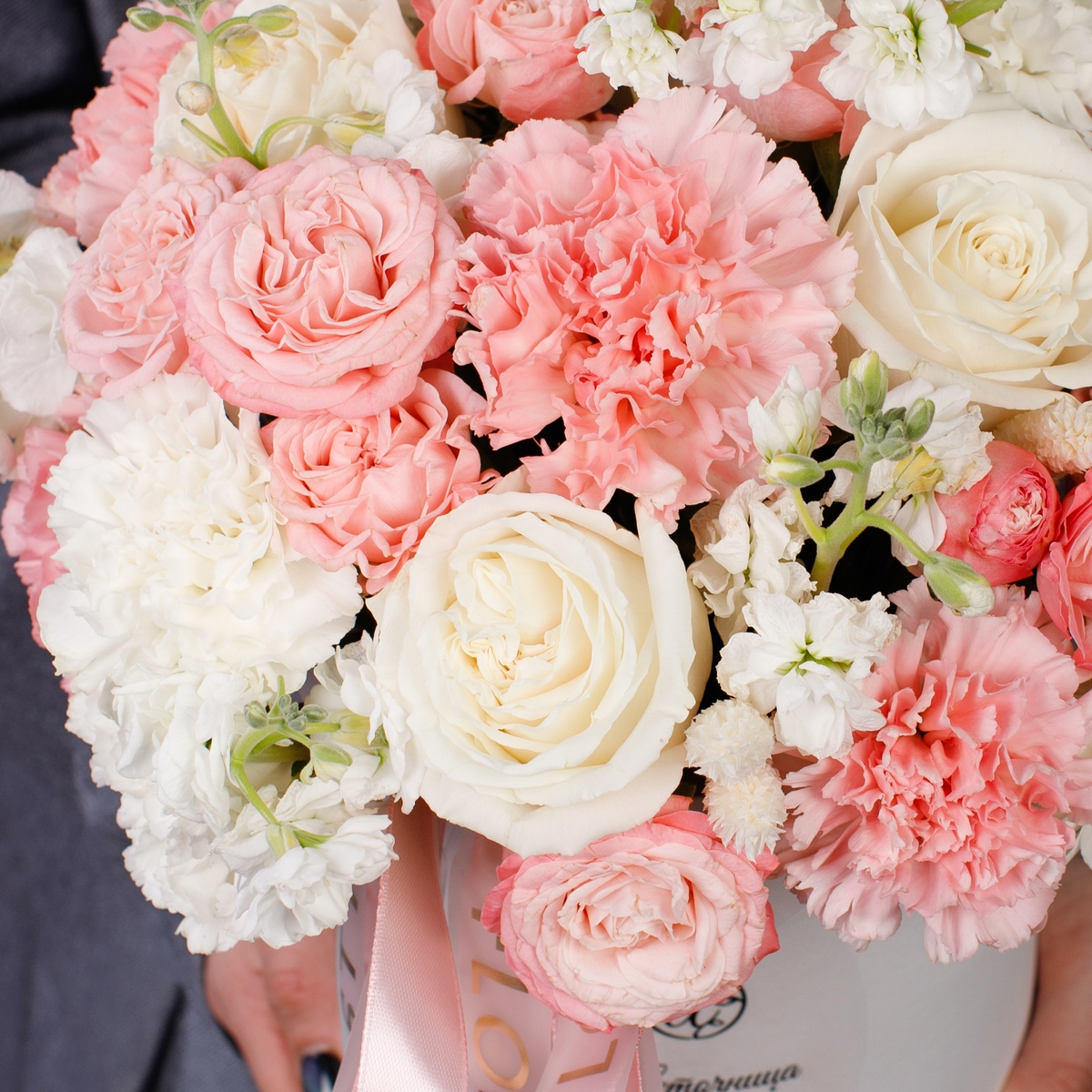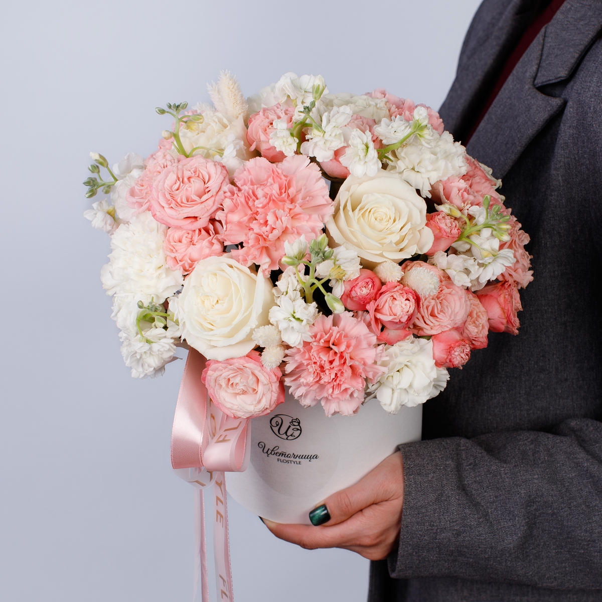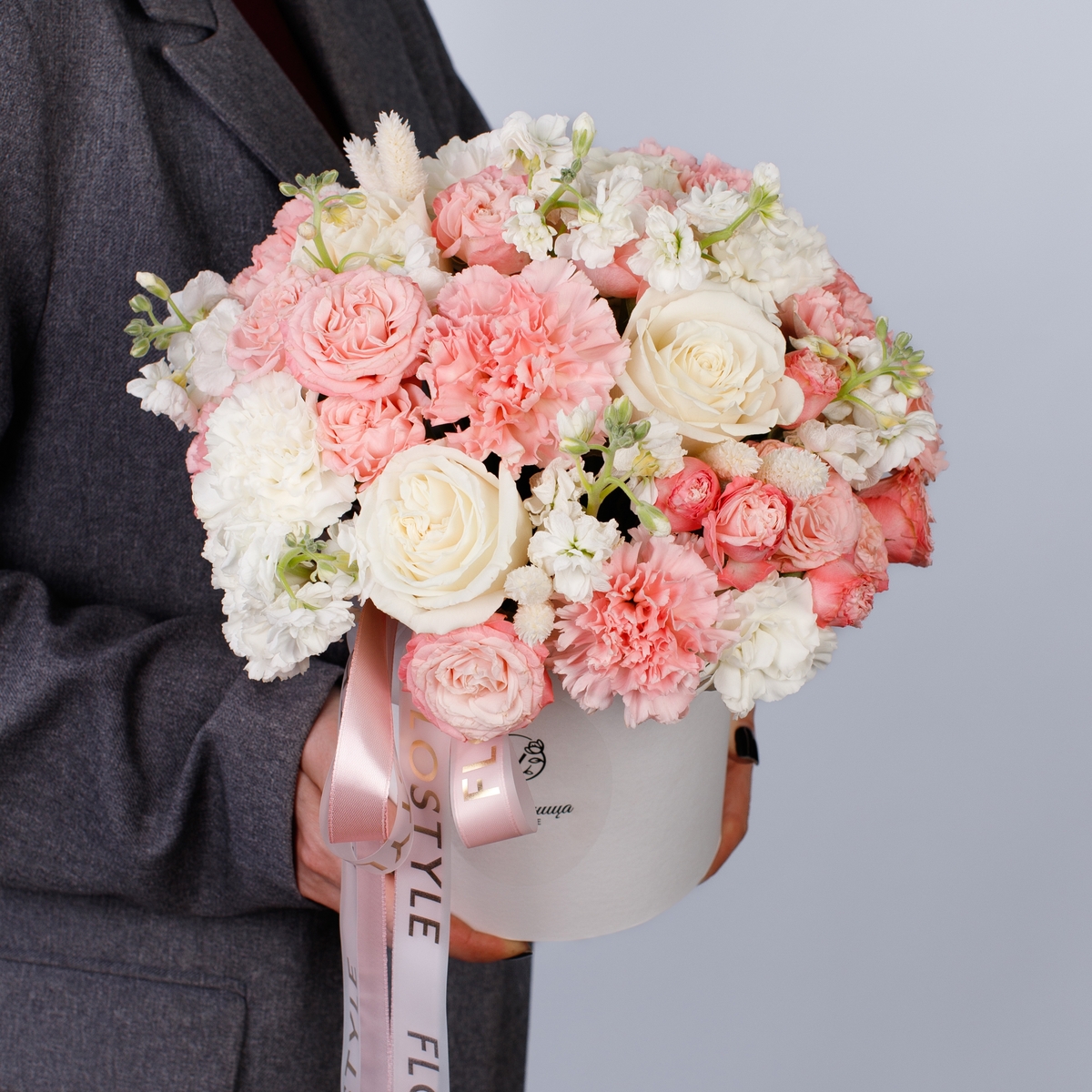Состав: Коробка белая S, Роза Playa Blanca - 5 шт, Роза кустовая Madam Bombastic - 4 шт, Гвоздика White/Pink - 13 шт, Маттиола кустовая White - 2 шт, Фалярис - 6 шт, Лента атласная