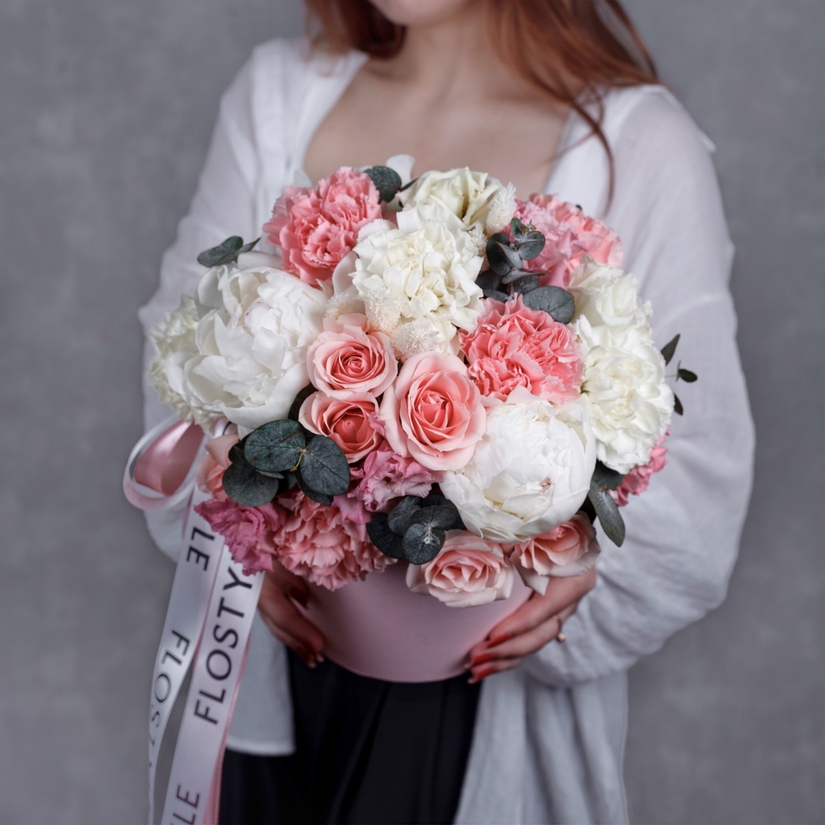 Состав: Коробка S (Pink), Пионы White - 3 шт, Роза кустовая Star Blush - 3 шт, Диантус Pink - 5 шт, Диантус White - 4 шт, Эустома Pink - 2 шт, Фалярис - 3 шт, Атласная лента