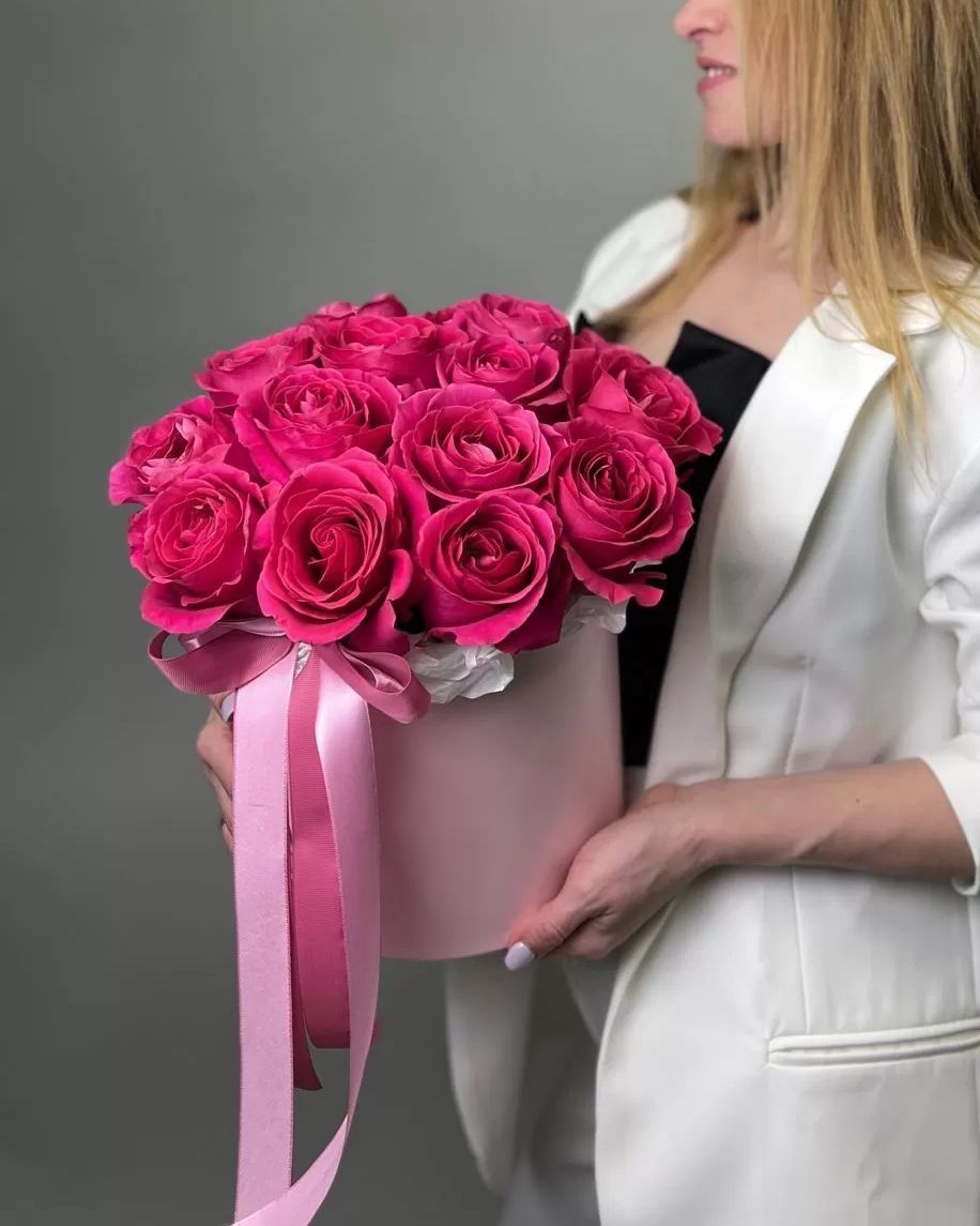 Состав: Коробка M (Pink), Роза Pink Floyd - 15 шт, Тишью белое, Лента атласная