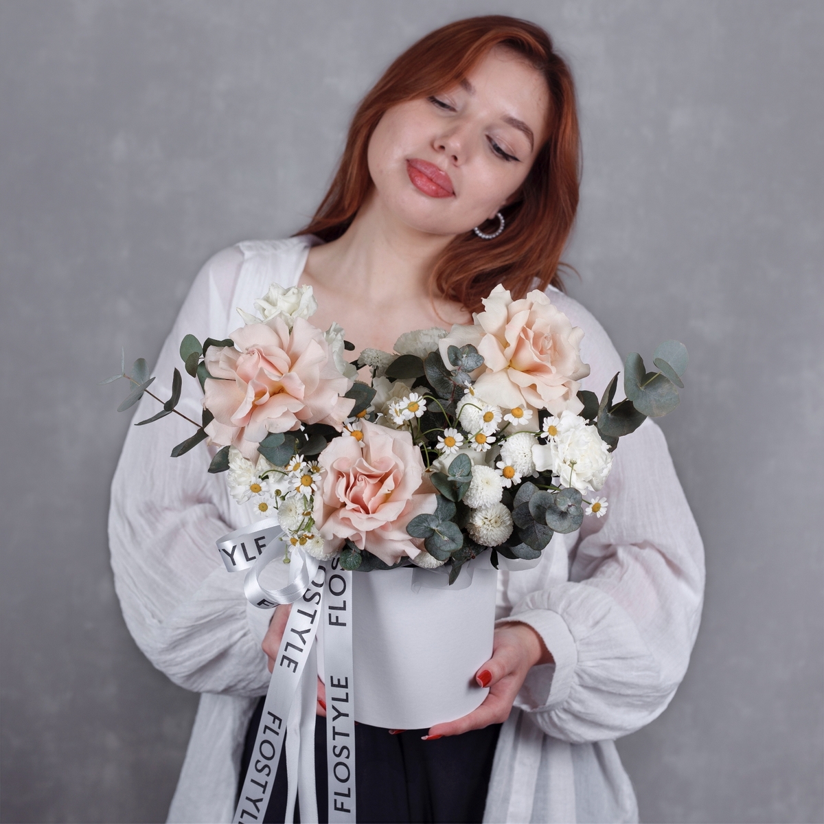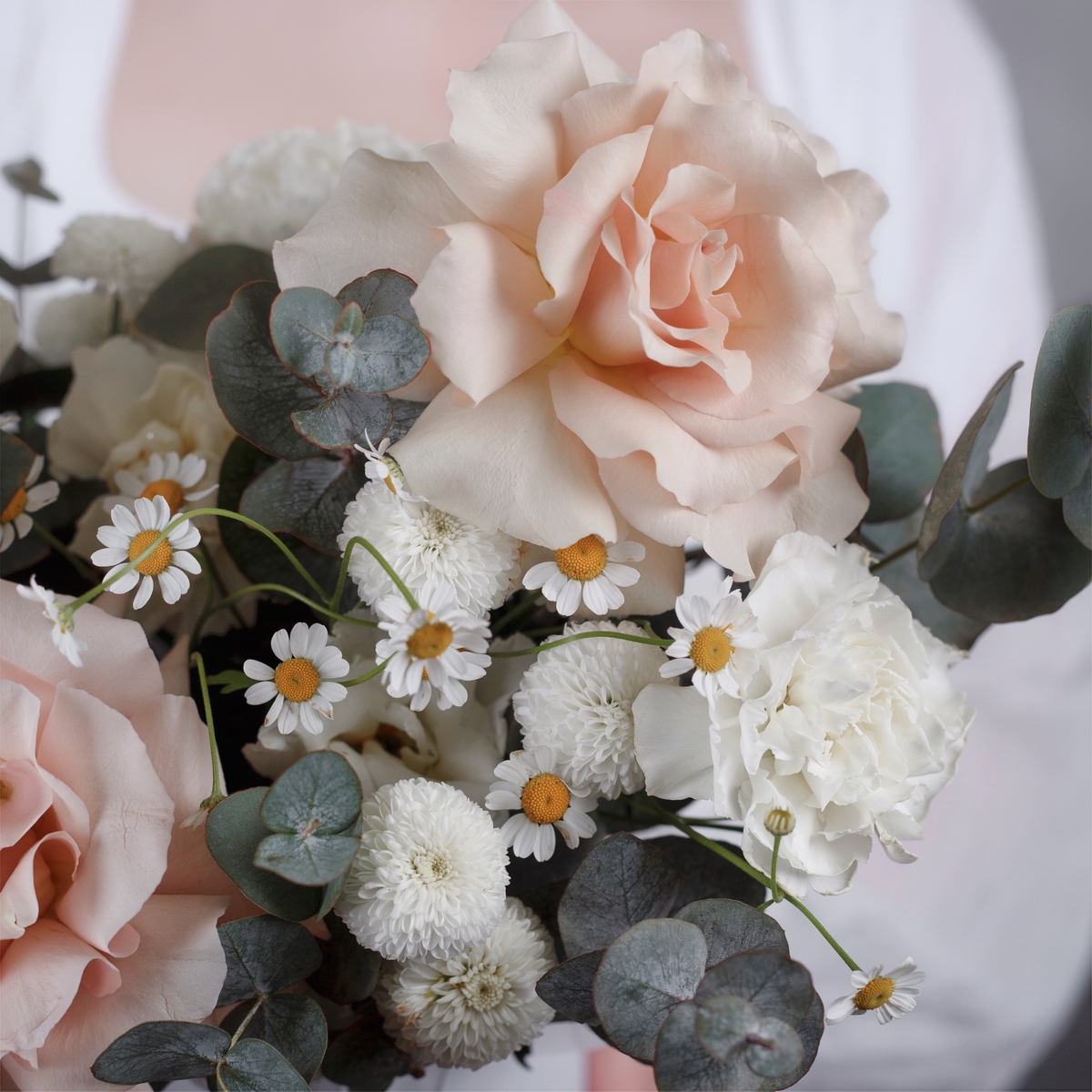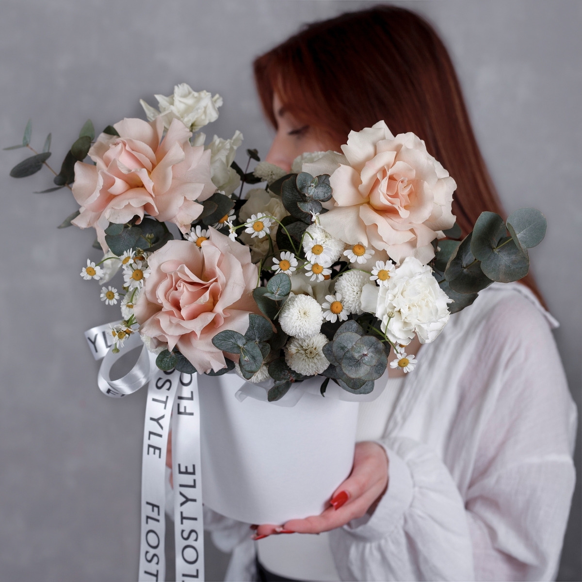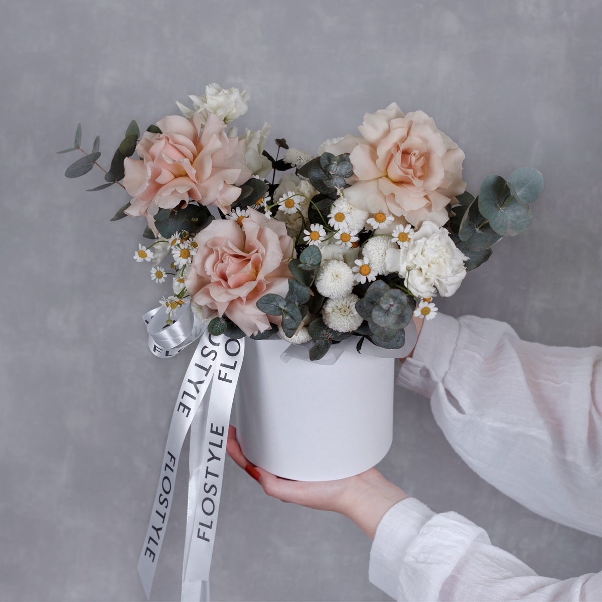 Состав: Коробка S (White), Роза Quicksand французская - 3 шт, Хризантема Newton - 2 шт, Эустома White - 1 шт, Ромашка танацетум - 2 шт, Диантус White - 3 шт, Эвкалипт - 1 шт, Атласная лента