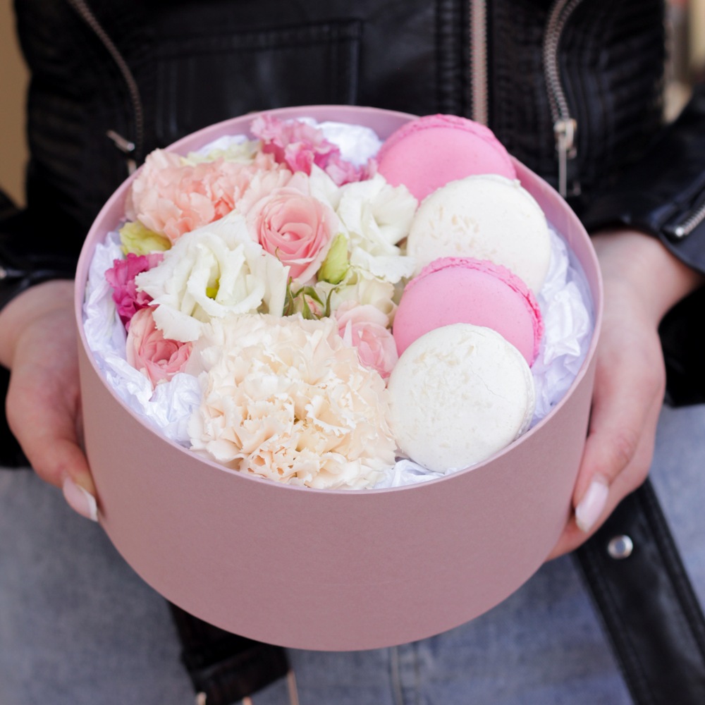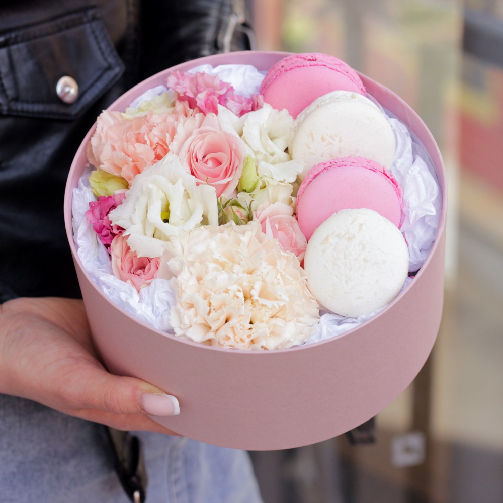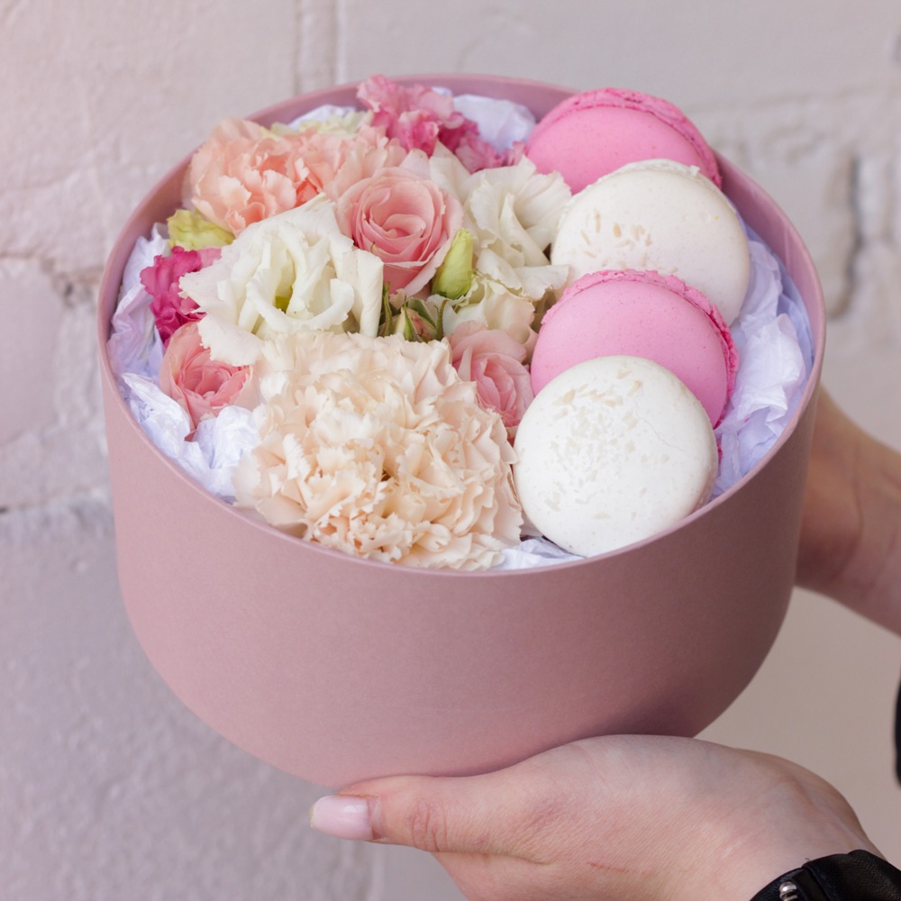Состав: Коробка S - 1 шт., Эустома - 1 шт., Диантус - 2 шт., Роза кустовая - 1 шт., Макаронс - 4 шт.