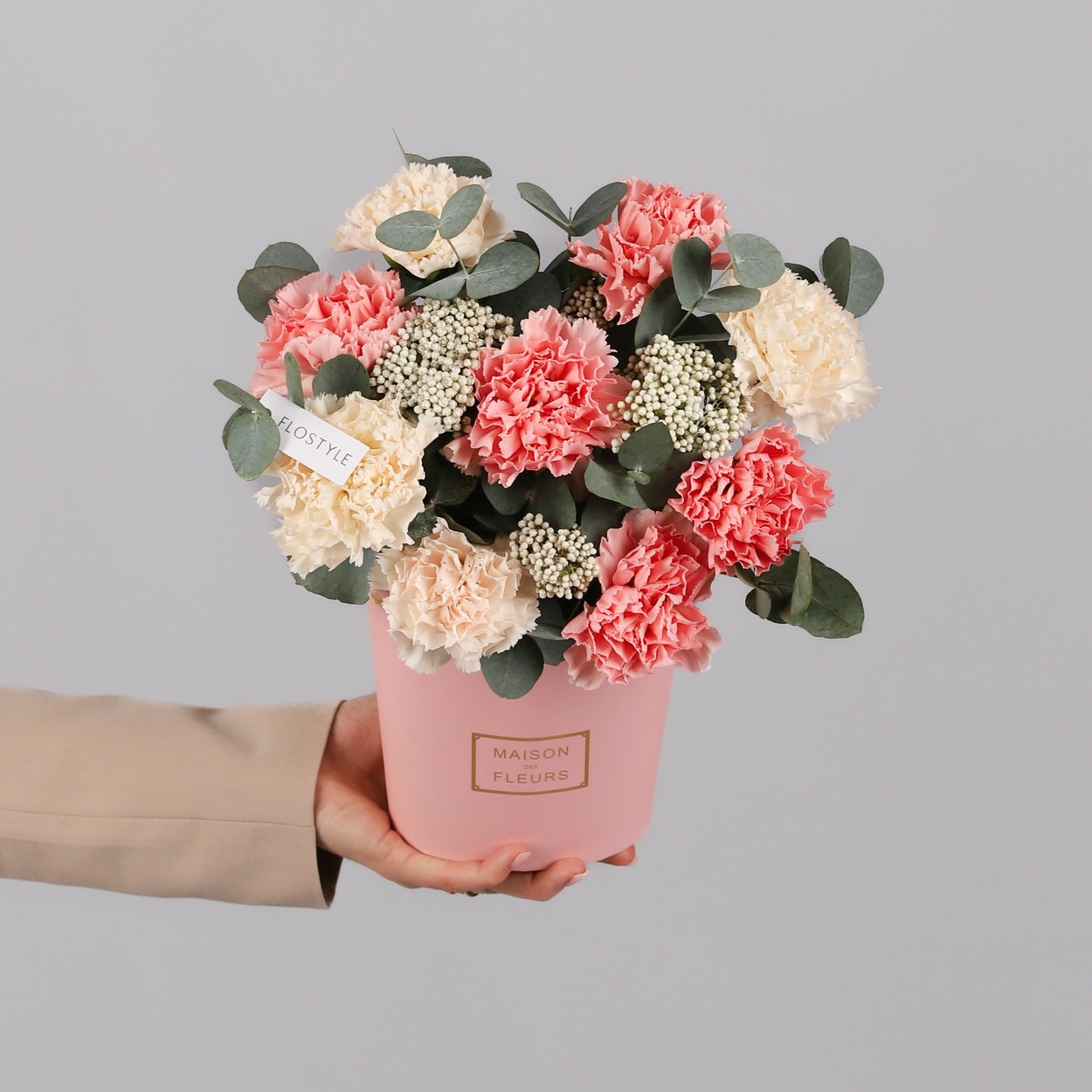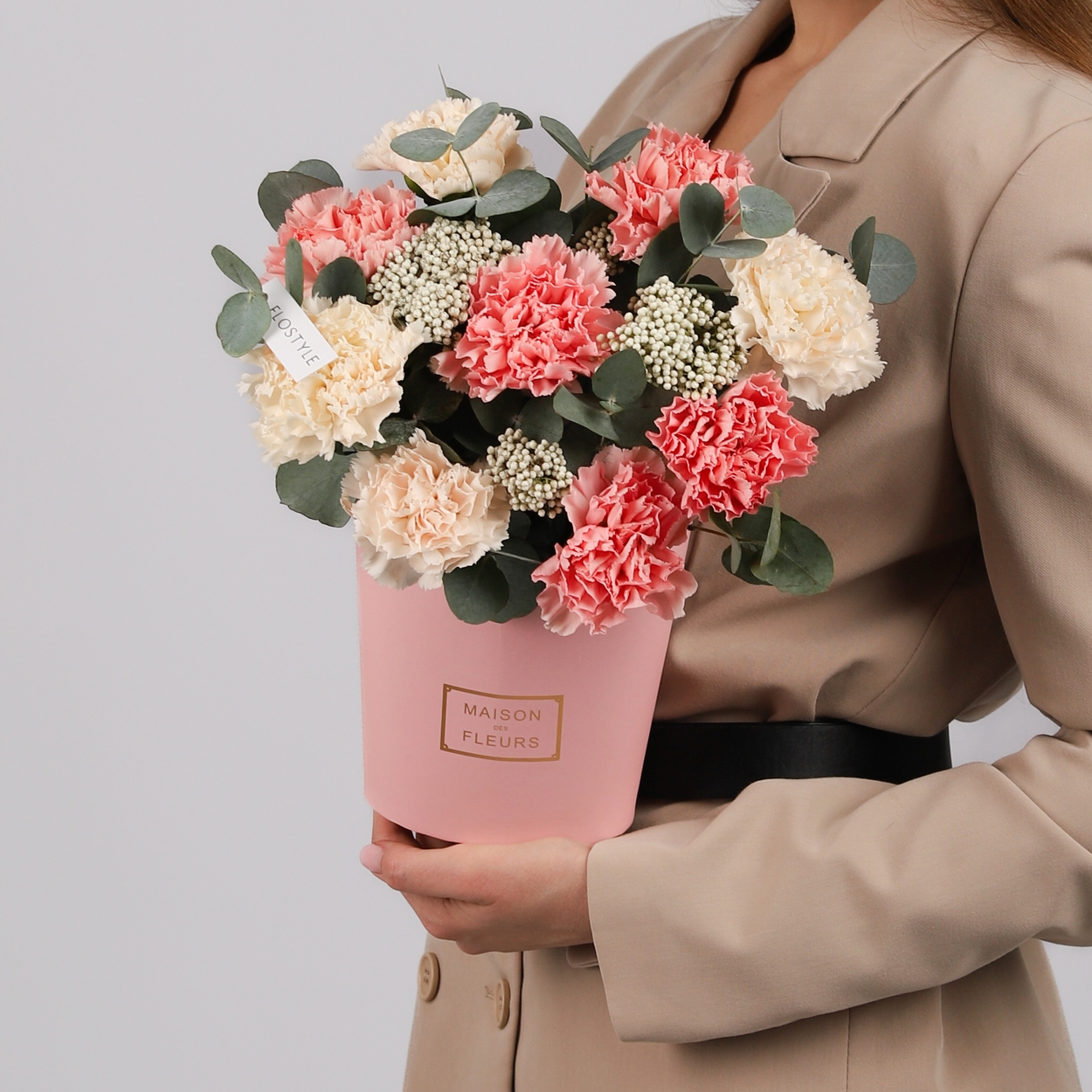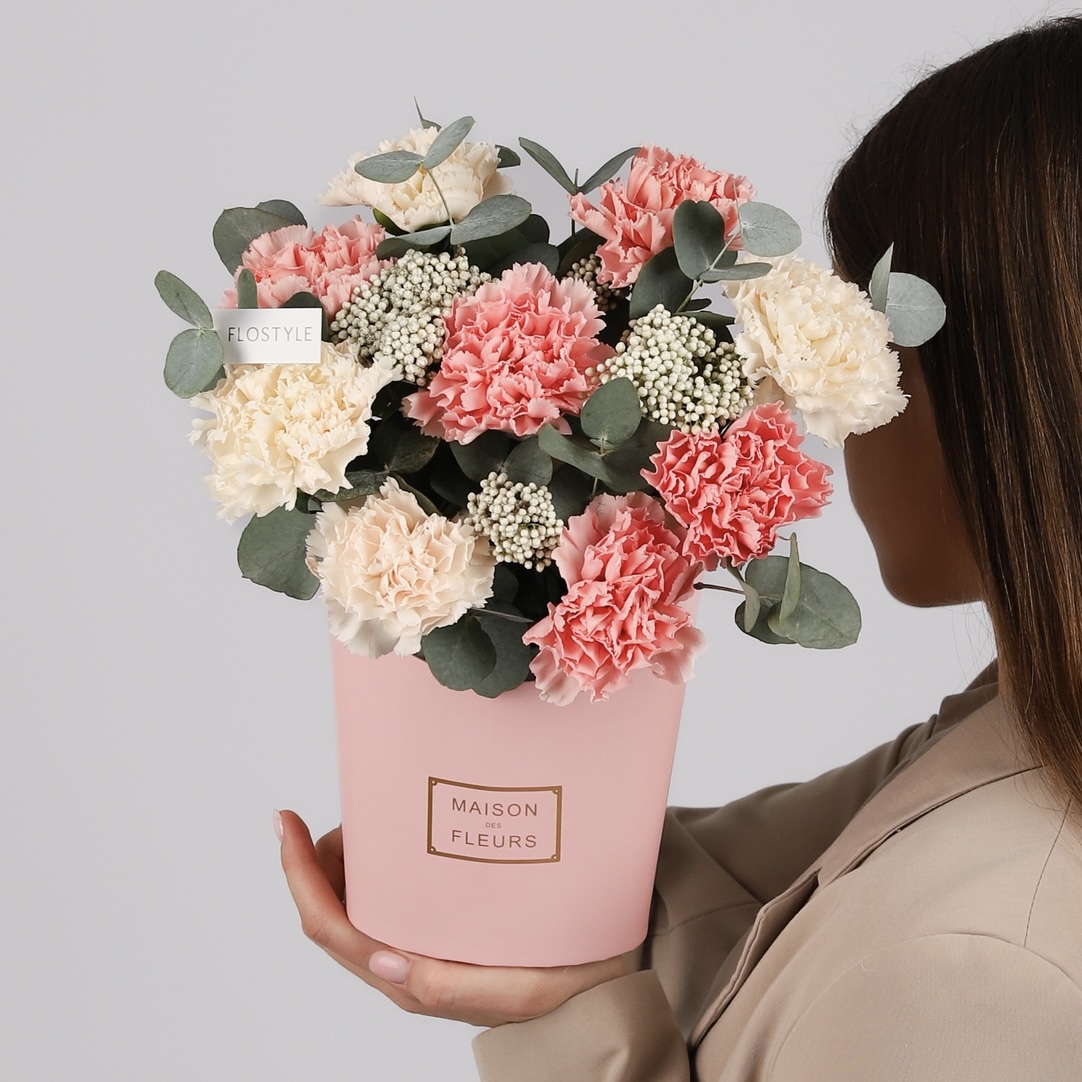 Состав: Коробка шляпная Maison розовая, Диантус Brut/Pink - 9 шт, Озотамнус - 2 шт, Эвкалипт - 1 шт,