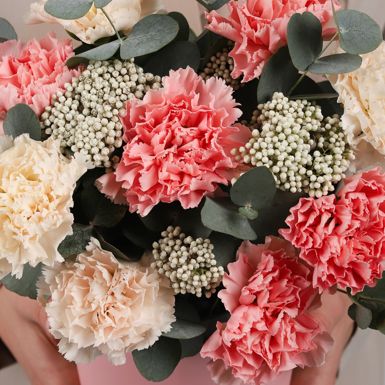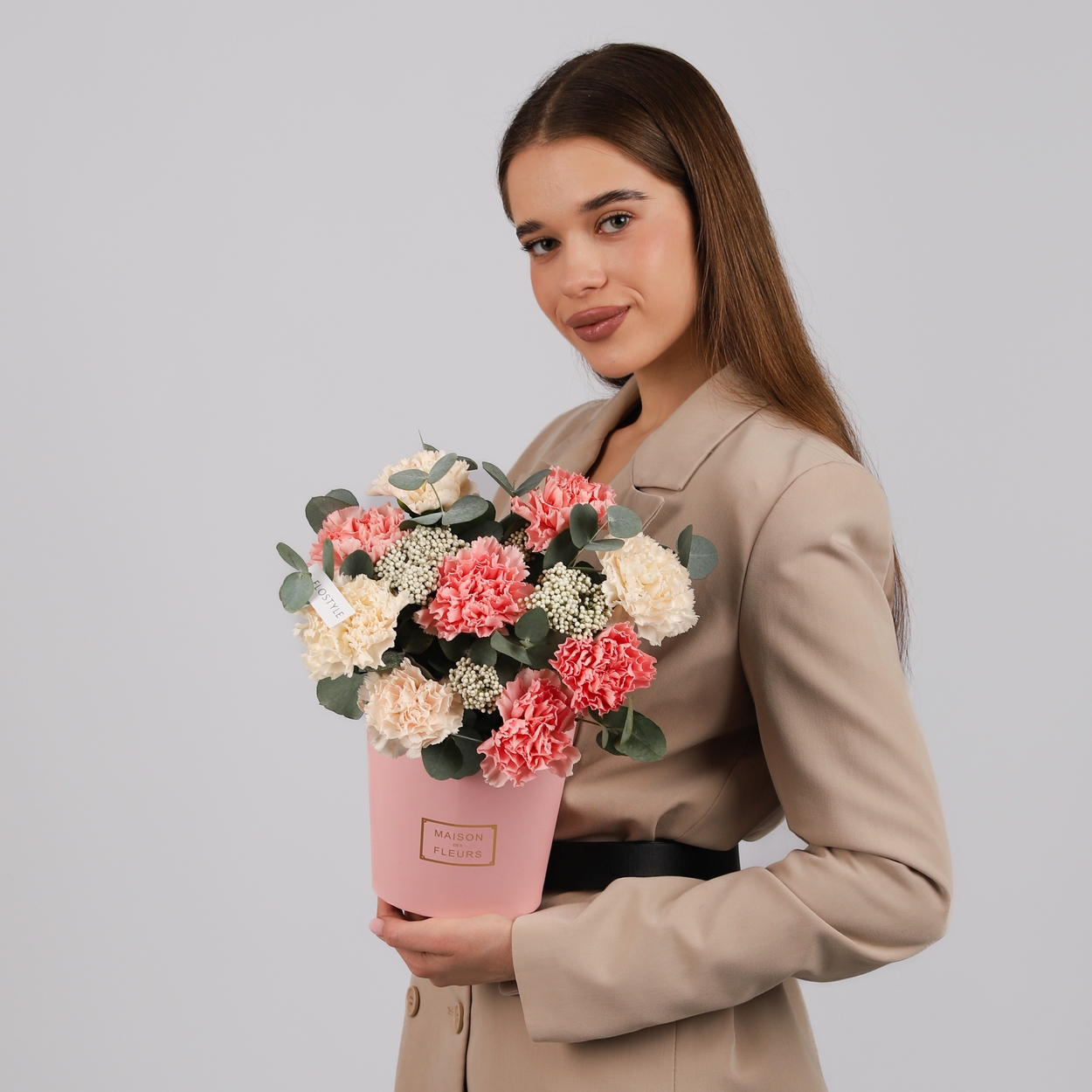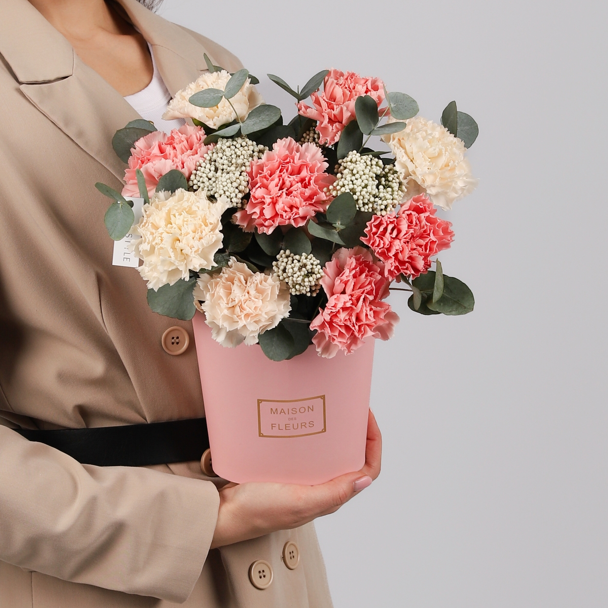 Состав: Коробка шляпная Maison розовая, Диантус Brut/Pink - 9 шт, Озотамнус - 2 шт, Эвкалипт - 1 шт,