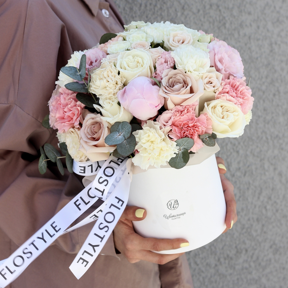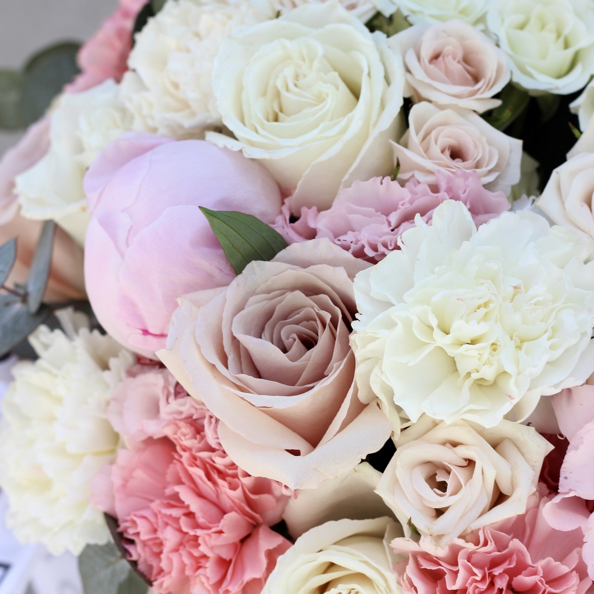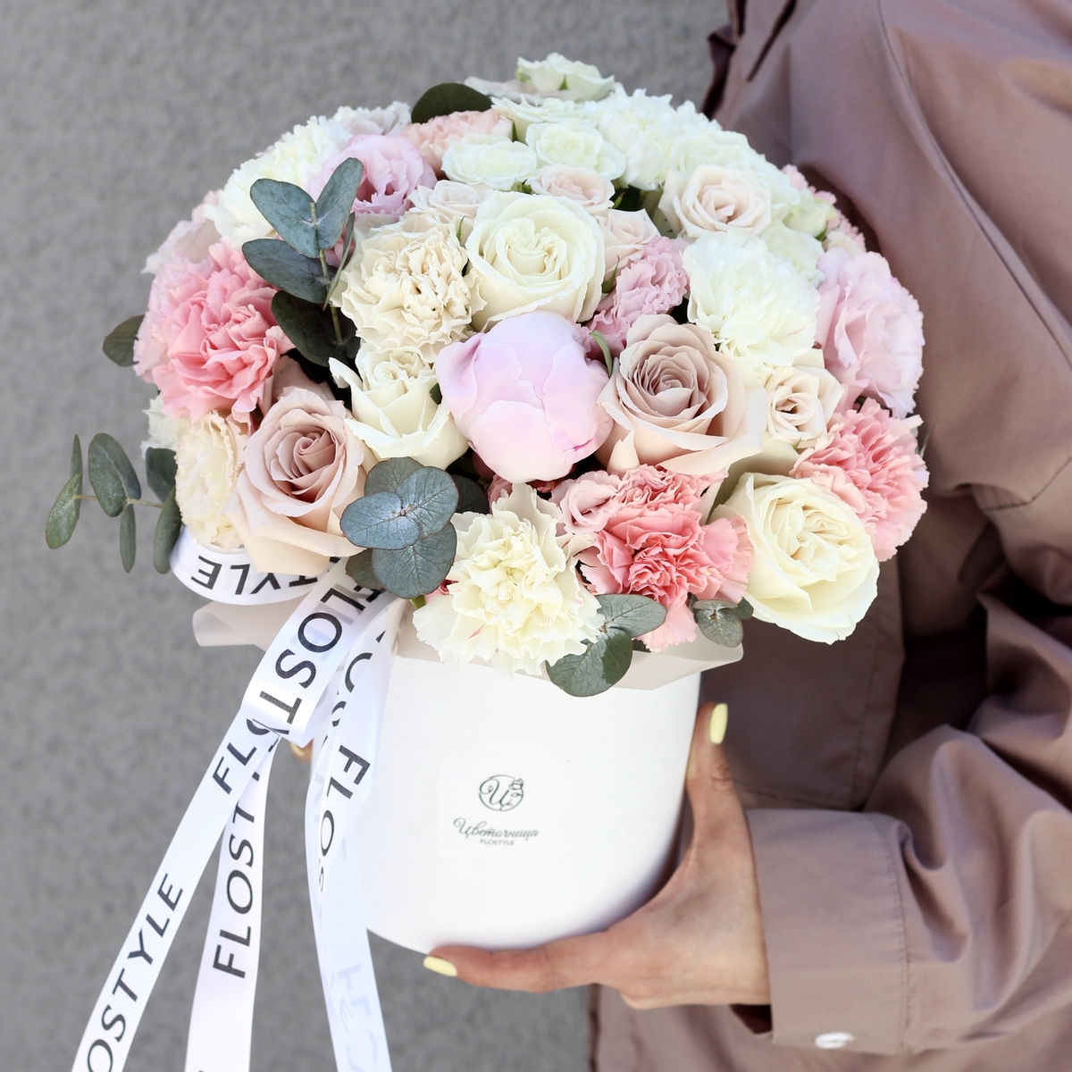 Состав: Коробка S (White), Роза Quicksand - 5 шт, Роза Playa Blanca - 4 шт, Пион Pink - 1 шт, Диантус Pink - 5 шт, Диантус White - 4 шт, Эустома Pink - 1 шт, Эустома White - 1 шт, Роза кустовая White - 3 шт, Эвкалипт - 0,5 шт, Лента атласная