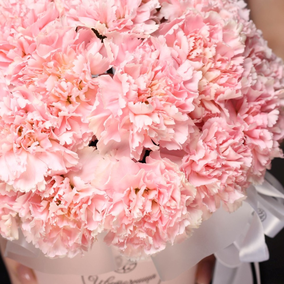 Состав: Коробка S (Pink), Диантусы Pink - 21 шт, Матовая белая прозрачная, Атласная лента